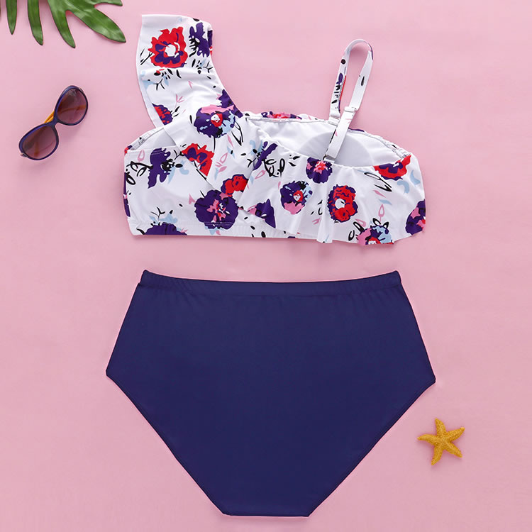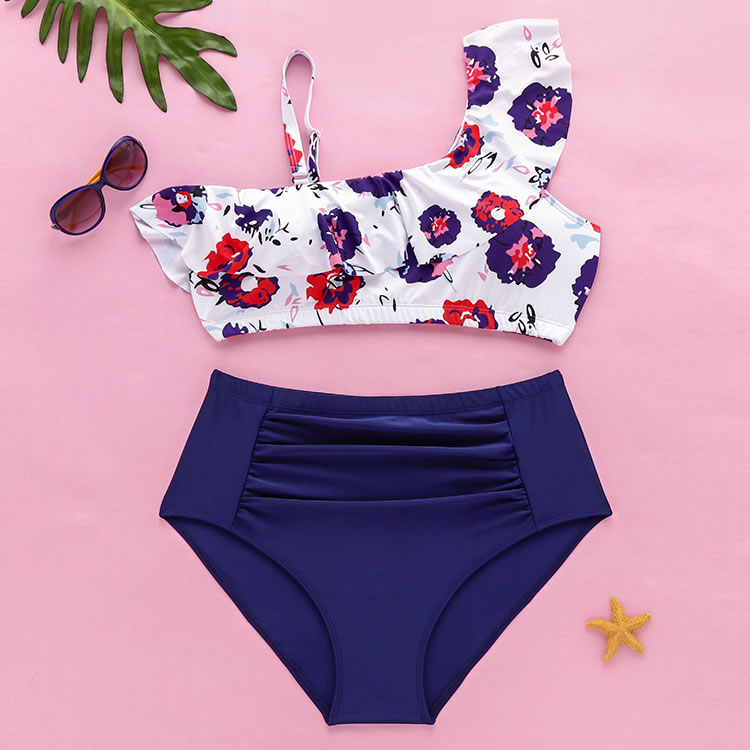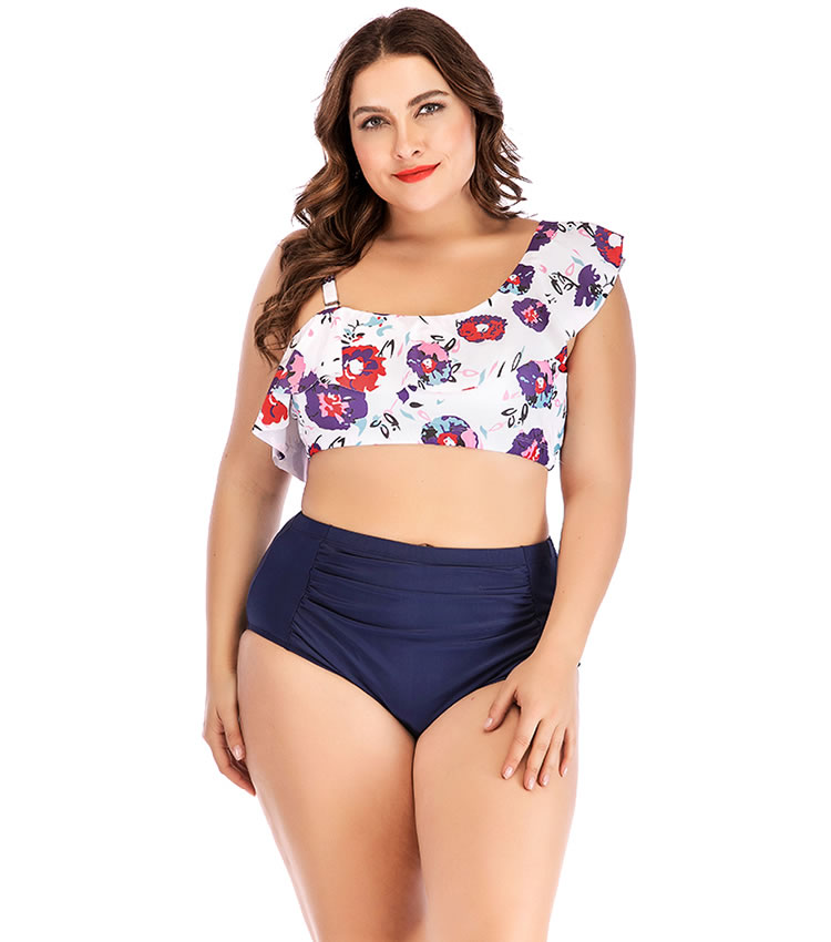 Show off your luscious tan in this plus size swimwear featuring one shoulder strap with a ruffled trim, a matching bottom with a high waist, a wide ruched waistband, and a full back.