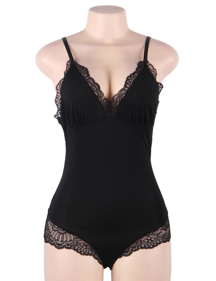 Daydream in casual comfort in this sexy plus size pajama set featuring a V-neckline, soft cups with a scalloped trim, a scalloped lace hemline, adjustable spaghetti straps, a snap crotch, and a cheeky cut back.