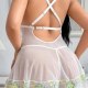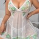 Feel fresh and feminine in this charming plus-size sheer babydoll. This delightful piece is crafted from soft, see-through mesh and features a beautiful floral lace trim with green and yellow daisy details along the bust and hem. The V-neckline and flowy A-line silhouette create a flattering and comfortable fit, while the elegant crisscross straps at the back add a touch of sophisticated style. It’s the perfect choice for a romantic night or simply feeling confident in your own skin.