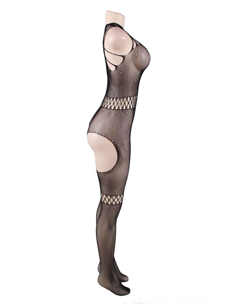 Look stunning from head to toe in this alluring plus size bodystocking featuring sheer fishnet cups with a multi-strap criss-cross neckline and back, a sheer fishnet bodice, an open crotch, a slashed cut-out leg detail, and an over the toe style. (Panty not included.)