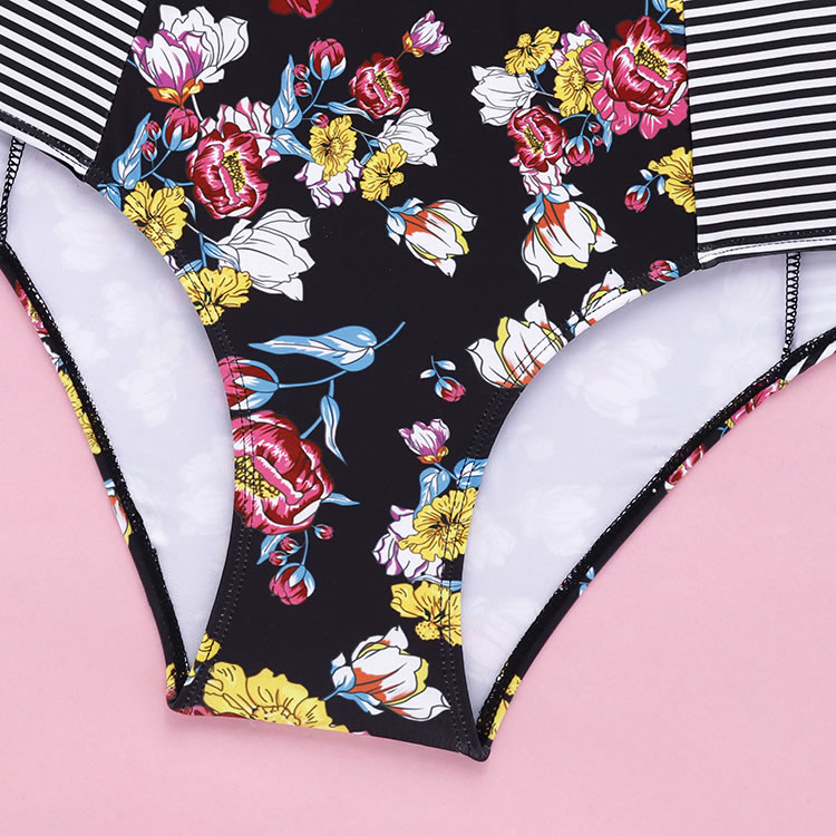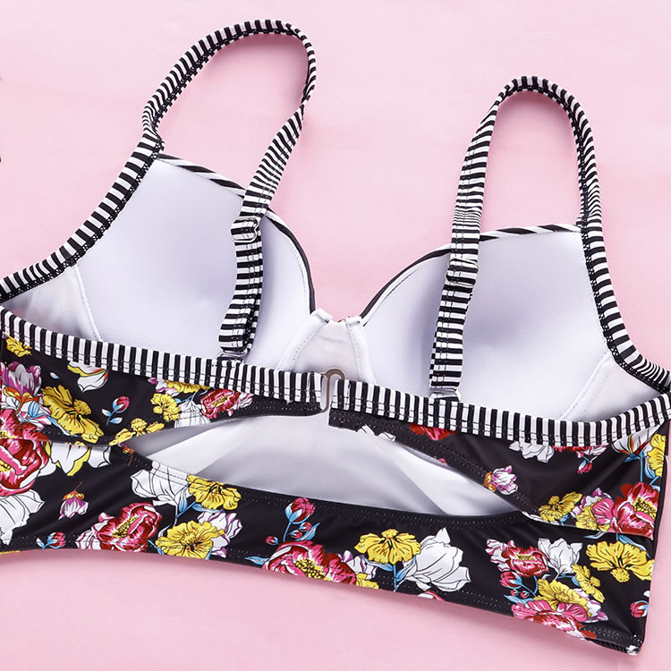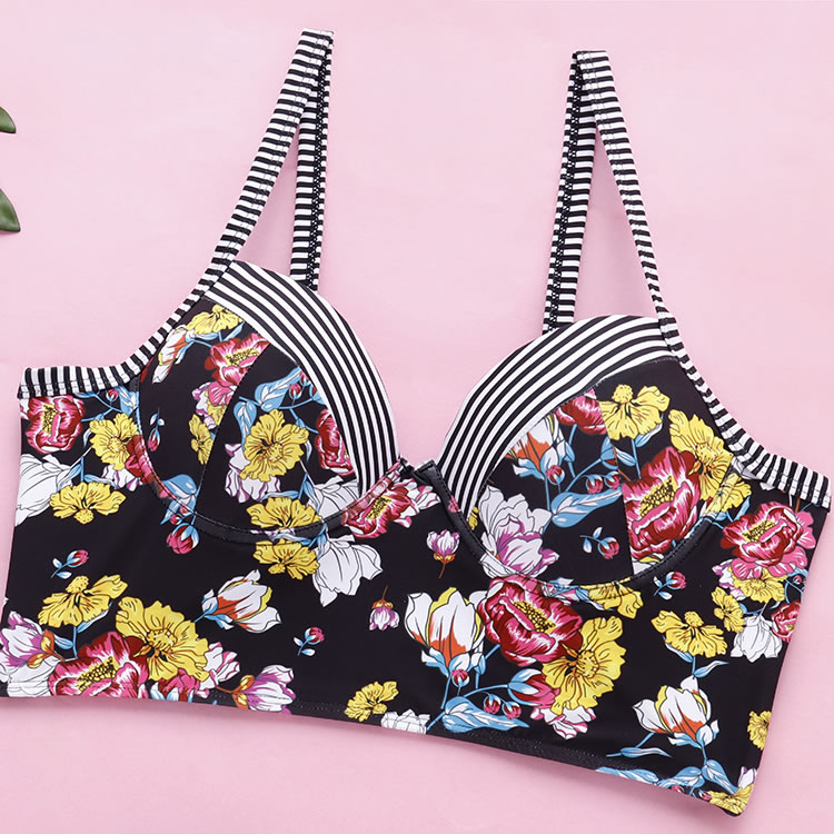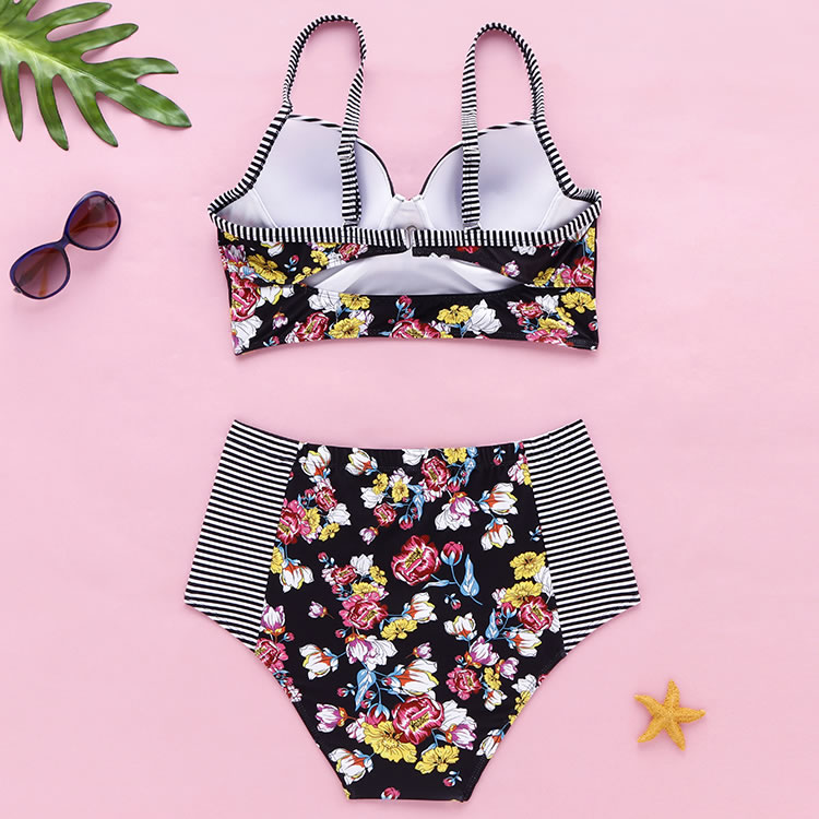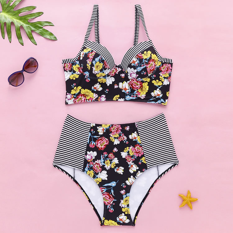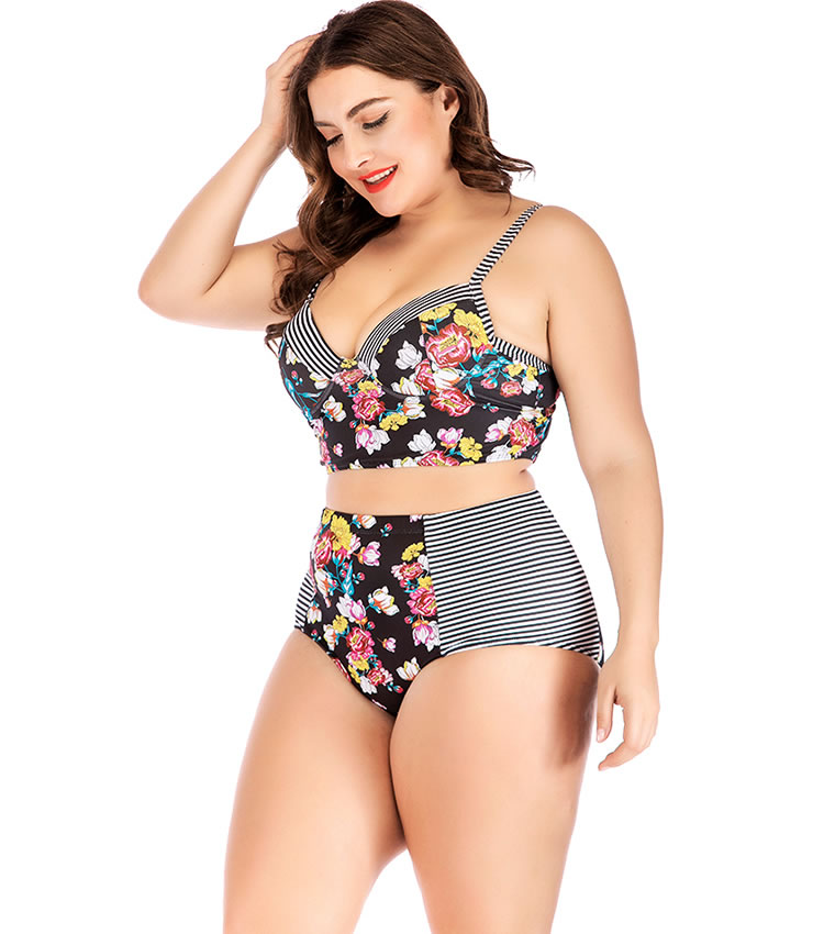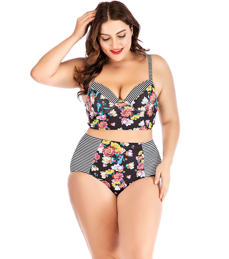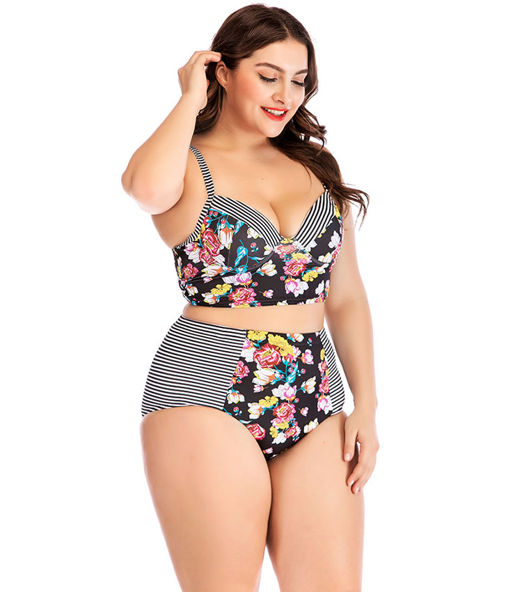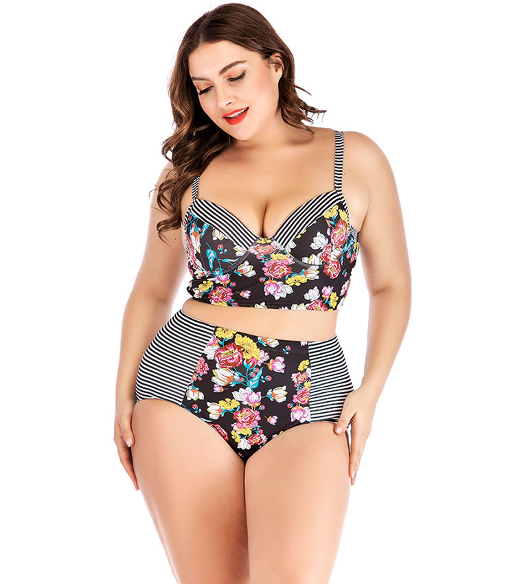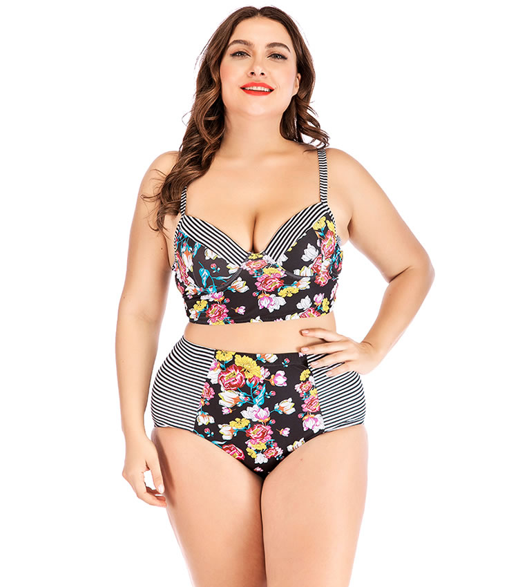 Plus Size Striped And Flower Underwire Two Piece Swimsuit