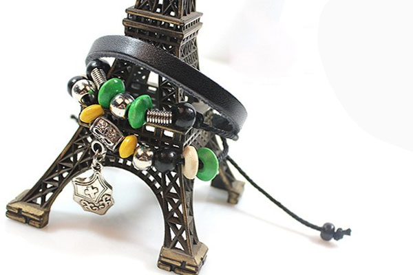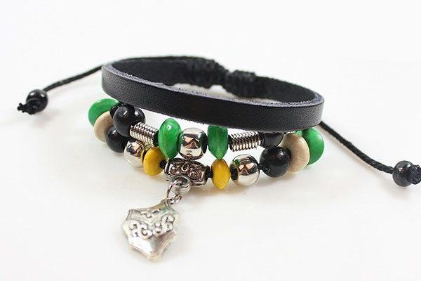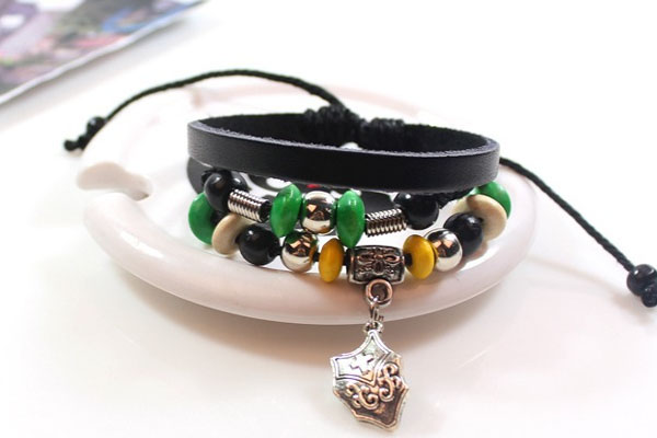 Punk Style Alloy Cross Shield Pendant Beads Drawstring Leather Rope Bracelet
