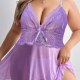 This lavender lingerie dress features a deep V-neckline with intricate lace detailing that frames the bust elegantly. The bodice is crafted from delicate floral lace, adding texture and charm, while a small bow at the center enhances the feminine silhouette. The skirt flows into a soft, flared hem made of smooth fabric that drapes gracefully. Thin adjustable straps offer comfort and a secure fit, making it ideal for romantic evenings or moments when you want to feel confident and alluring.