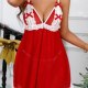 This festive red Christmas lingerie dress blends holiday charm with a flirty silhouette. Featuring delicate white lace trim along the edges and a deep V-neckline, it’s accented with small red bows at the bust for a playful touch. The sheer mesh fabric and open back design add a bold flair, while the flared skirt creates a soft, feminine look perfect for seasonal celebrations.