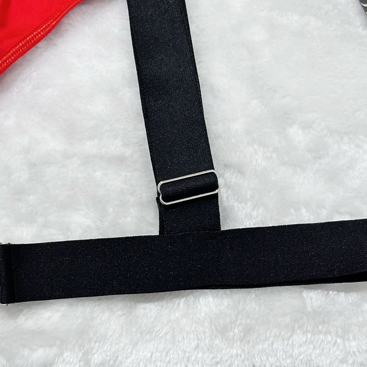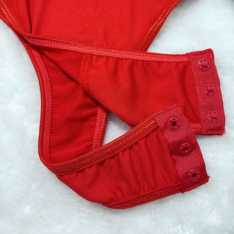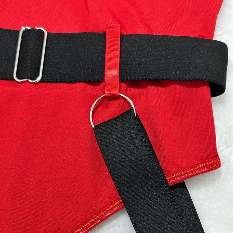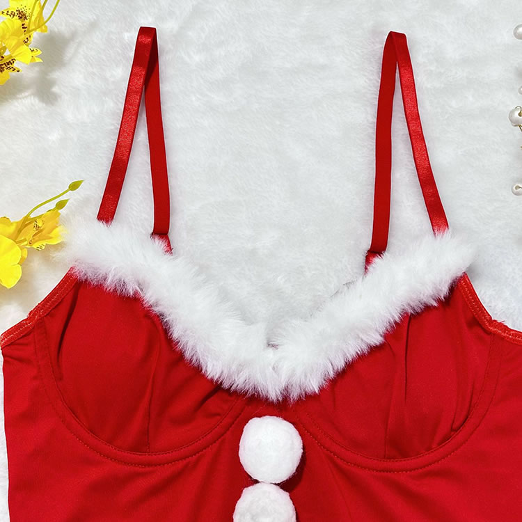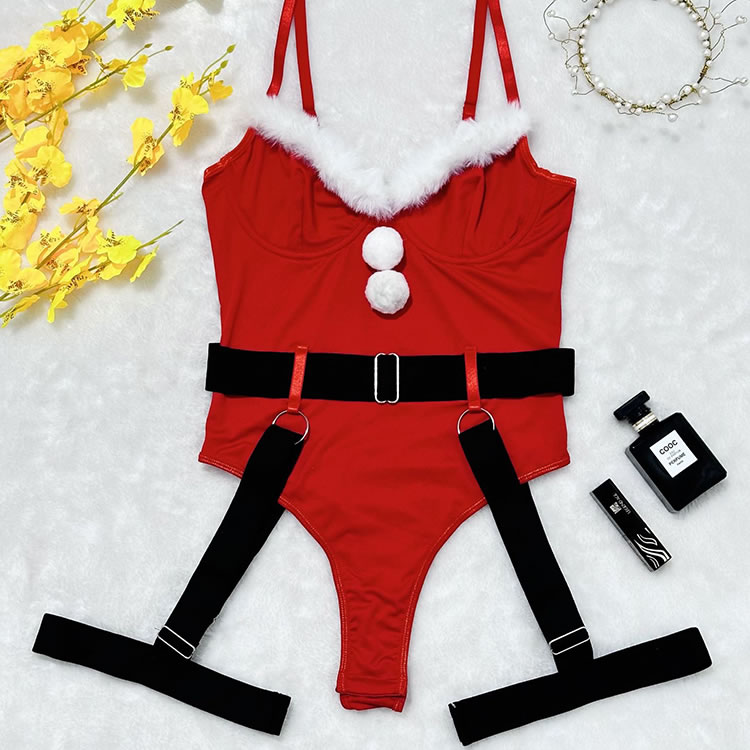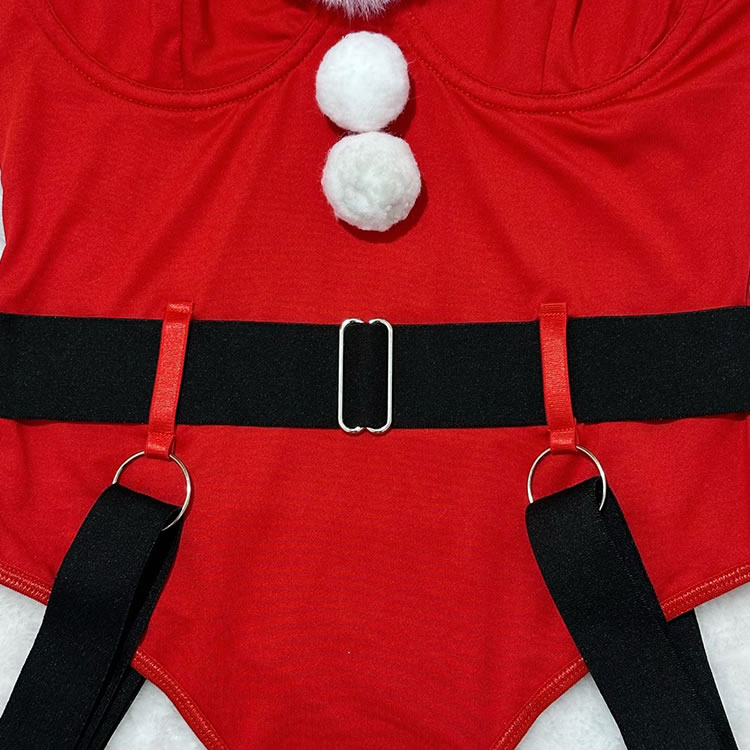 Celebrate the holidays in style with this eye-catching red bodysuit that combines festive flair with bold design. The top features a deep V-neckline with soft white fur trim and two prominent white pom-poms for a classic holiday look. A black waistband with sturdy garter straps secures thigh-high stockings, adding an edgy touch. Designed to fit snugly and stay in place, it’s ideal for Christmas parties, themed events, or romantic evenings. Easy to wear and made for attention-grabbing moments.