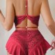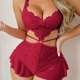 This bold burgundy teddy features a lace bra with a deep V-neckline and floral patterns that highlight the bust. The teddy includes a cutout waistband with crisscross straps and a small heart-shaped accent, adding a playful touch. A flirty ruffled hem and matching lace trim.