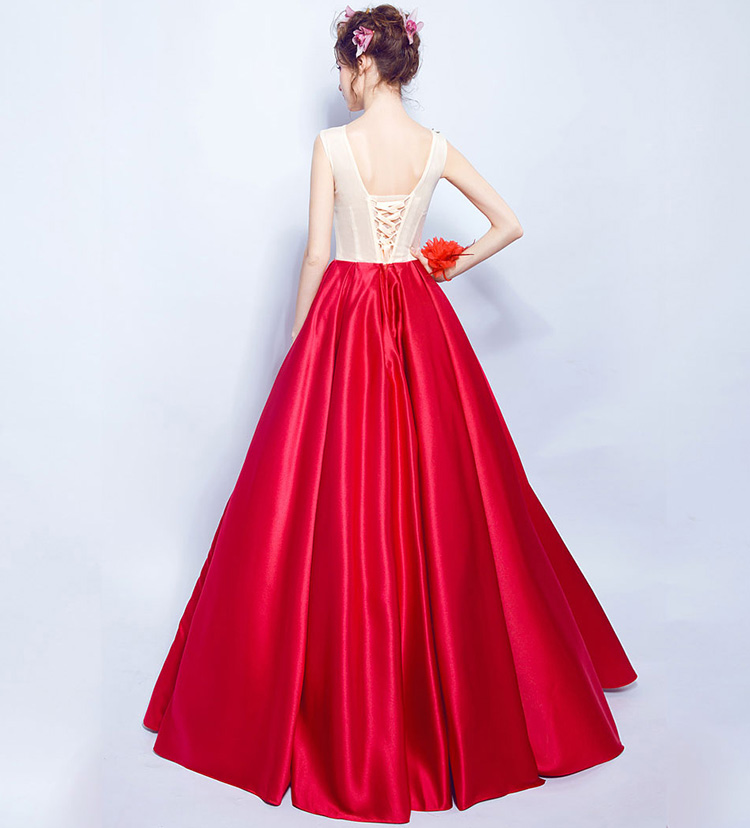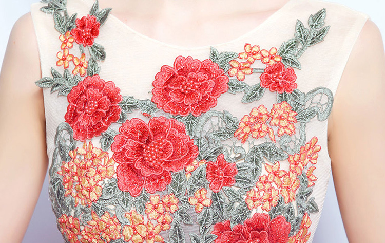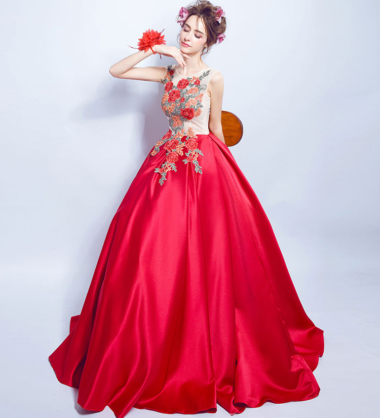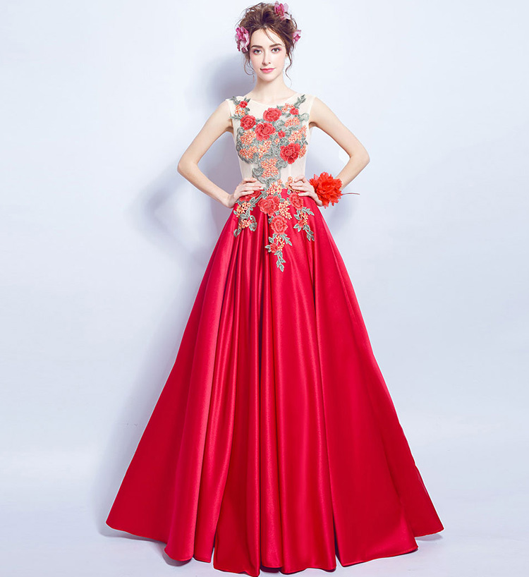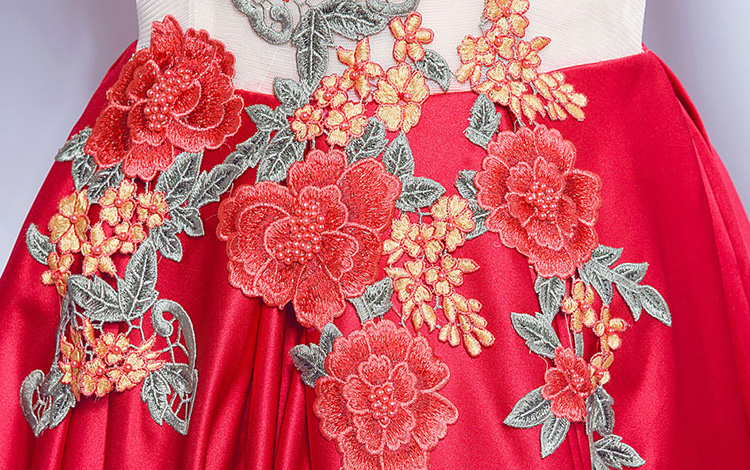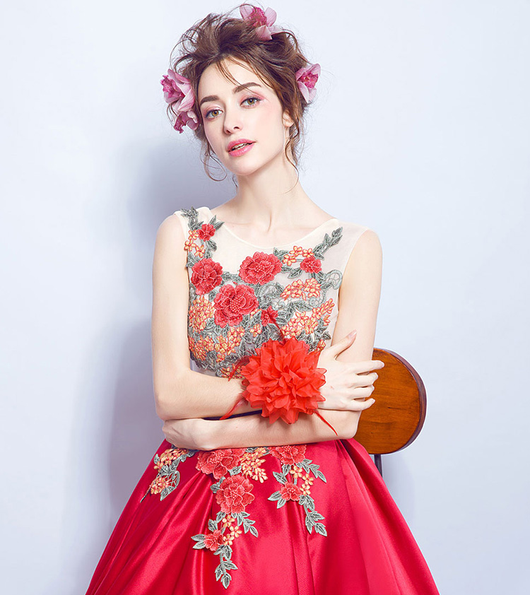 Red Sleeves Peony Flower Lace Backless Long Evening Dress