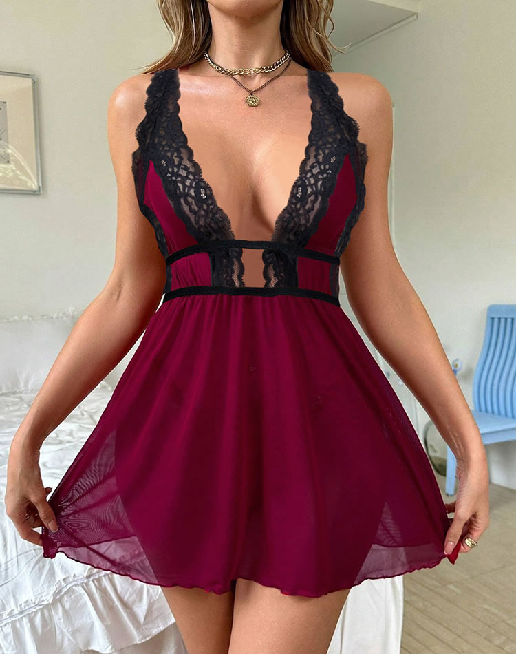 This elegant lingerie set is designed to exude sophistication and allure. The deep V-neckline with lace trim adds a touch of elegance, while the rich burgundy color enhances its romantic appeal. The sheer fabric provides a delicate and feminine look, complemented by the flowing skirt that flatters your figure. This set is perfect for adding a touch of sexy to your intimate moments.