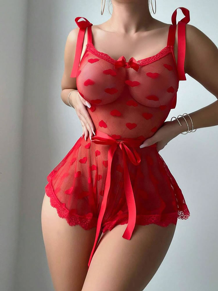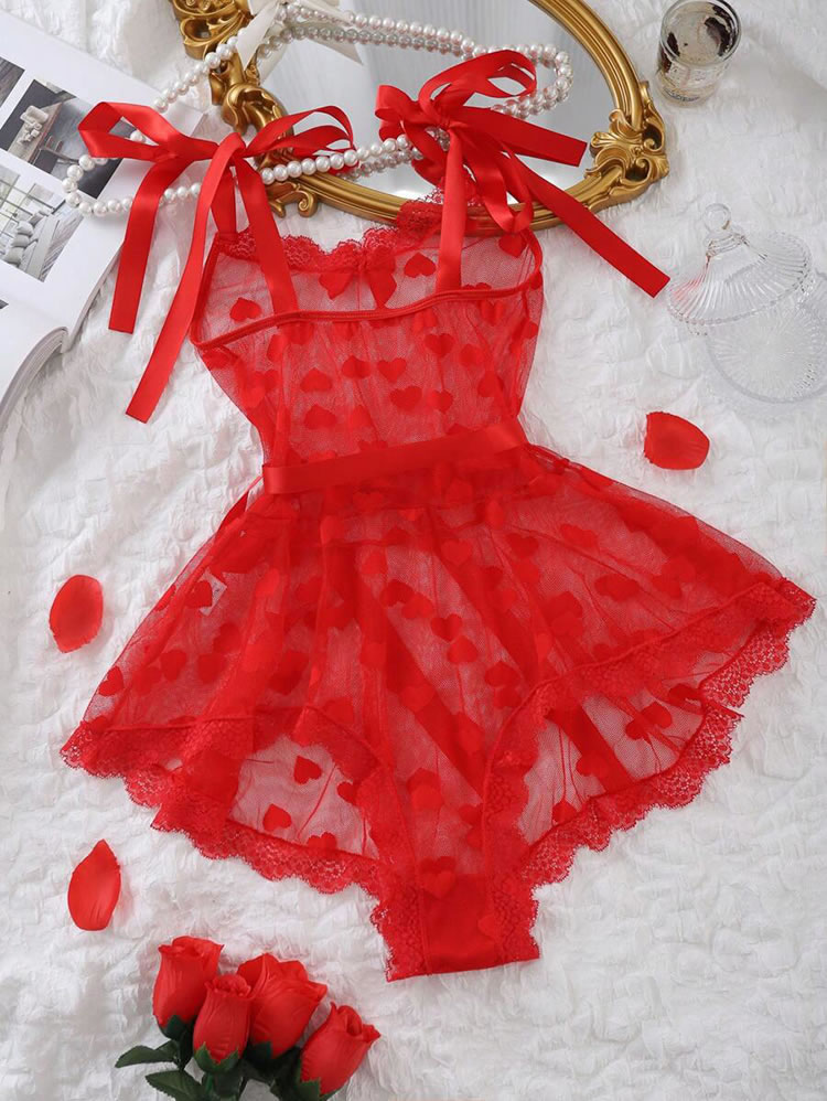 This enchanting lingerie set is designed to captivate with its playful and romantic aesthetic. The deep V-neckline is adorned with delicate lace trim, adding a touch of elegance. The sheer fabric features charming heart patterns, enhancing the overall allure. Adjustable spaghetti straps ensure a perfect fit, while the waist is cinched with a red ribbon tie, creating a flattering silhouette. The hem is finished with intricate lace detailing, adding to the sophistication and charm of the piece.