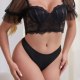 This black lingerie set features a structured bustier top with intricate lace detailing and soft, layered ruffle sleeves made from sheer mesh fabric. The top includes a supportive underwire design and a hook and eye back closure, while the short sleeves add a touch of vintage charm. Paired with high-cut briefs that offer a clean finish, this ensemble combines bold shaping with delicate details for a striking look.