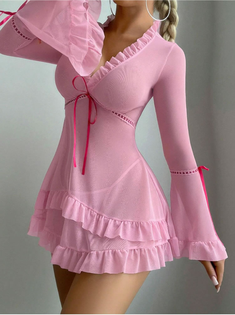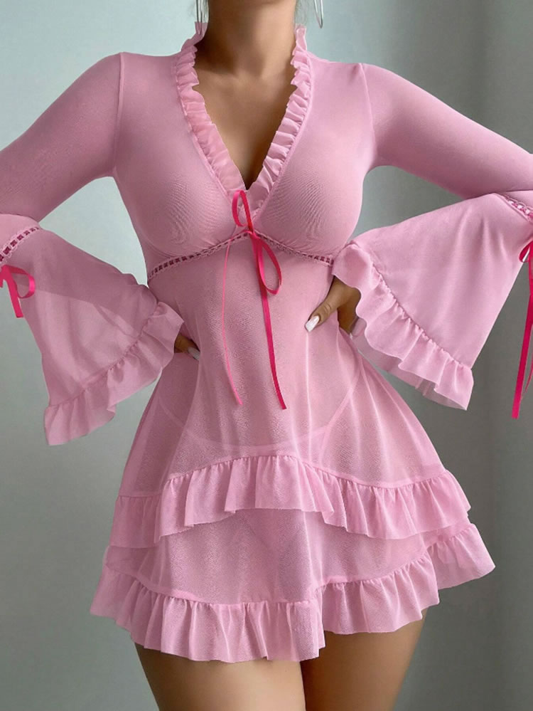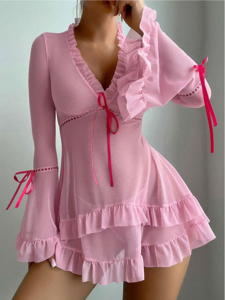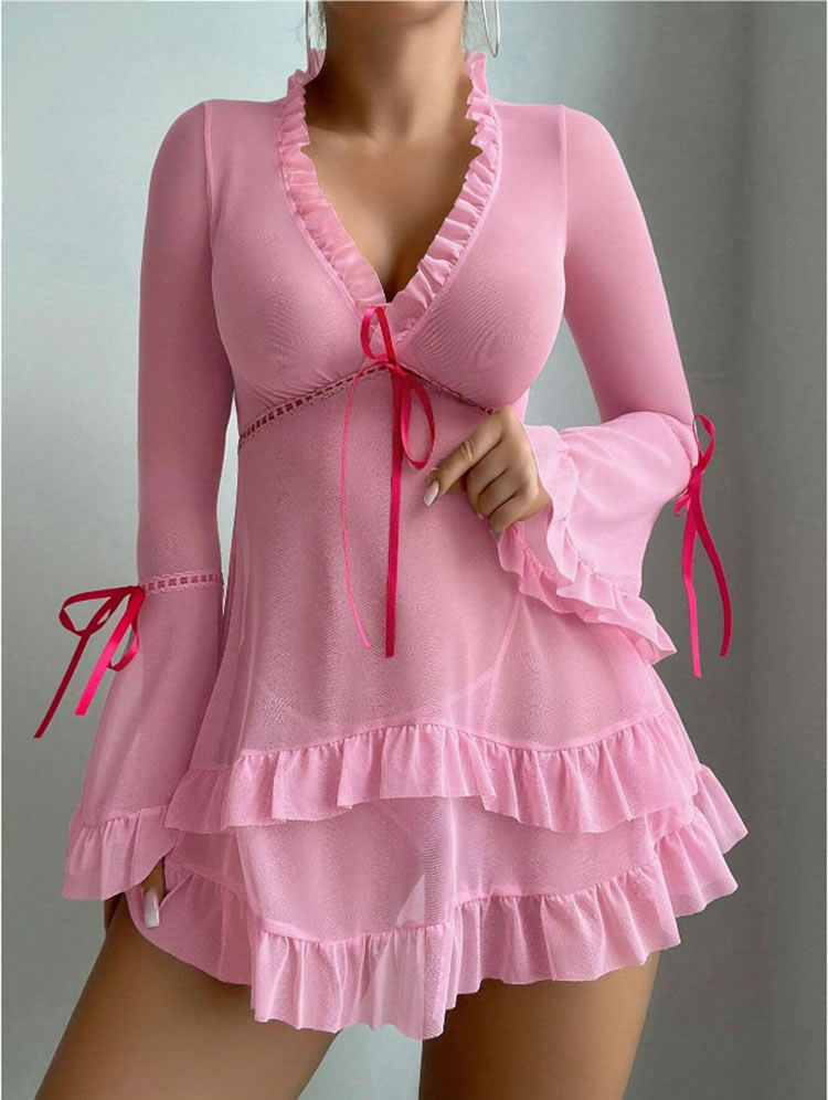 This enchanting lingerie set is designed to exude both romance and elegance. The deep V-neckline with ruffled trim creates a captivating focal point, while the long bell sleeves add a touch of sophistication. The sheer mesh fabric enhances the allure, allowing for a playful and alluring look. The waist is accentuated with a charming drawstring tie, adding a feminine touch. The flared hem with layered ruffles adds a romantic and whimsical feel, making this set perfect for those who appreciate both style and comfort in their intimate apparel.