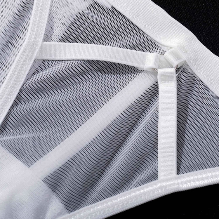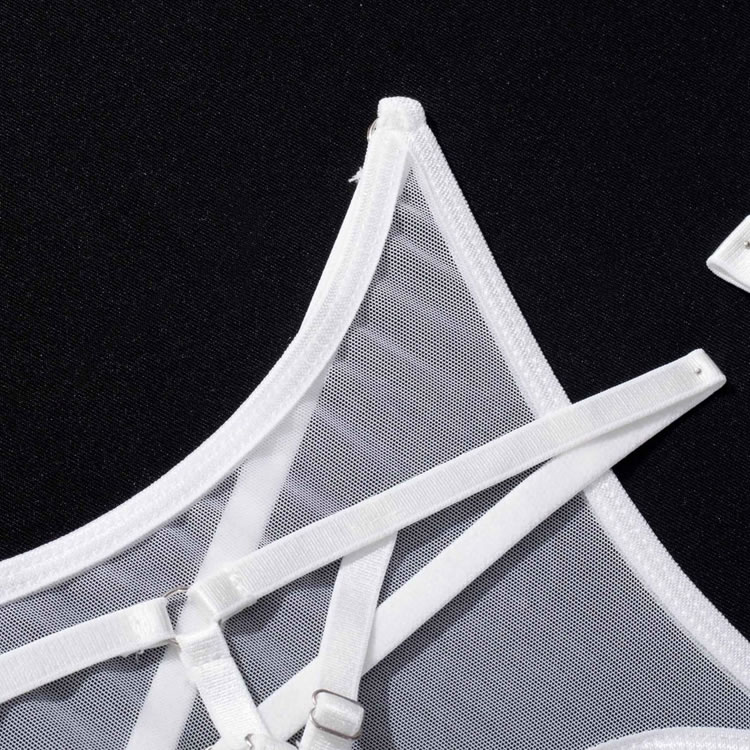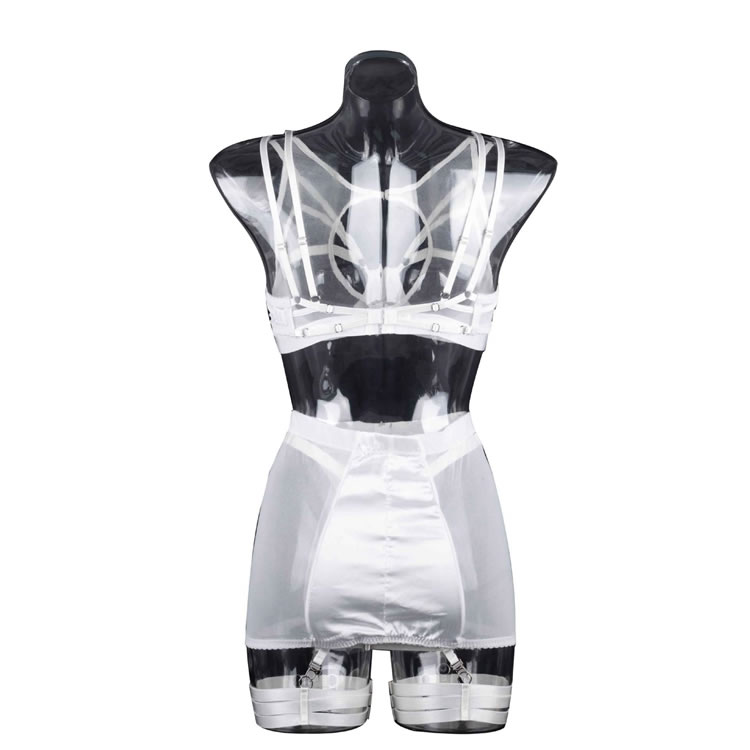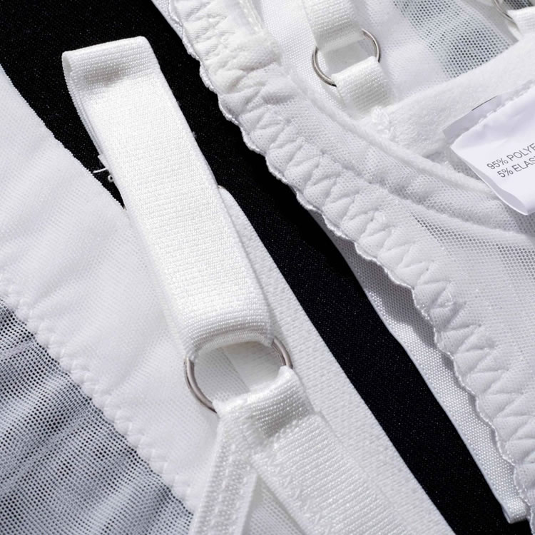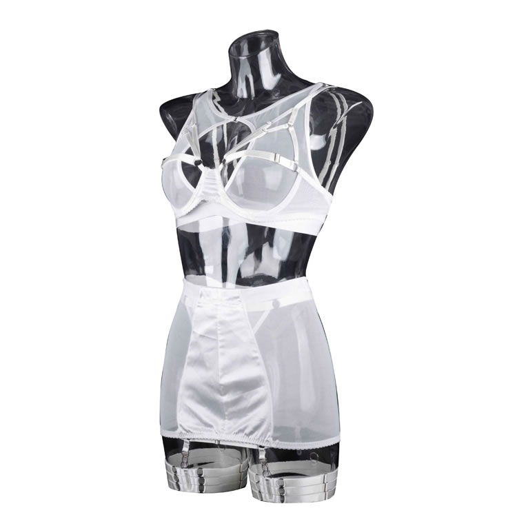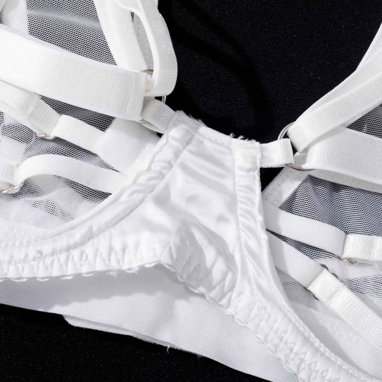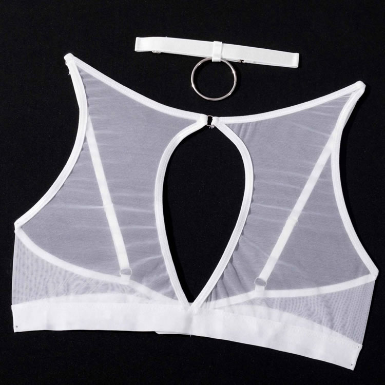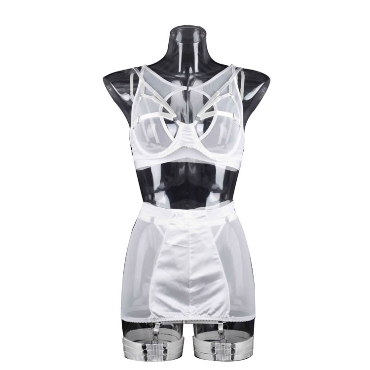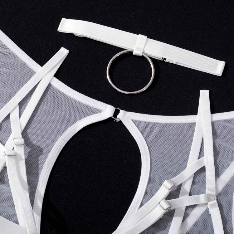 Entice your sweetheart in this sultry bra set featuring a multi-strapped neckline, a choker with O-ring accents, a cut-out bust, sheer mesh underwire cups, a hook and eye back closure, a high waisted skirt with garter straps, wraparound leg garters, and a strappy panty.