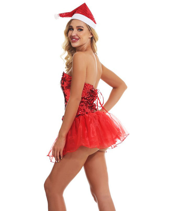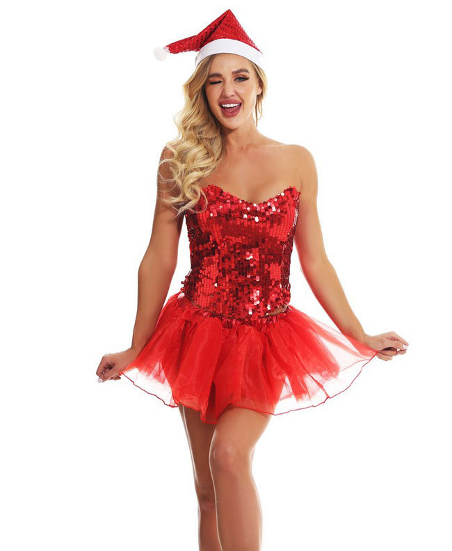 Have a holly jolly sex-mas in this Santa's Sexy Helper Lingerie Costume featuring sequin corset with a red lace-up back closure, a matching mini skirt and a santa hat.