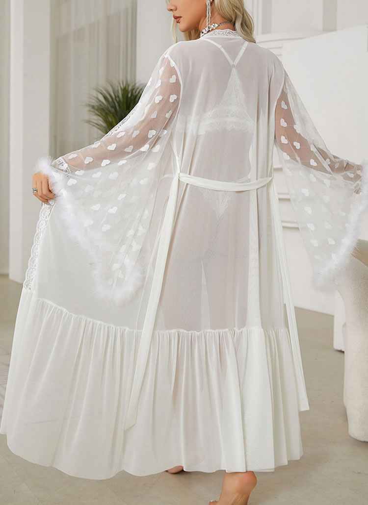 This alluring lingerie set is designed to exude elegance and sophistication. The deep V-neckline is adorned with intricate lace detailing, adding a touch of romance and allure. The sheer fabric enhances the visual appeal, creating a seductive and feminine look. While the flowing skirt provides a comfortable and graceful silhouette. The bell sleeves feature heart patterns and feather trim, adding a charming and playful detail. This set is perfect for special occasions or intimate moments.