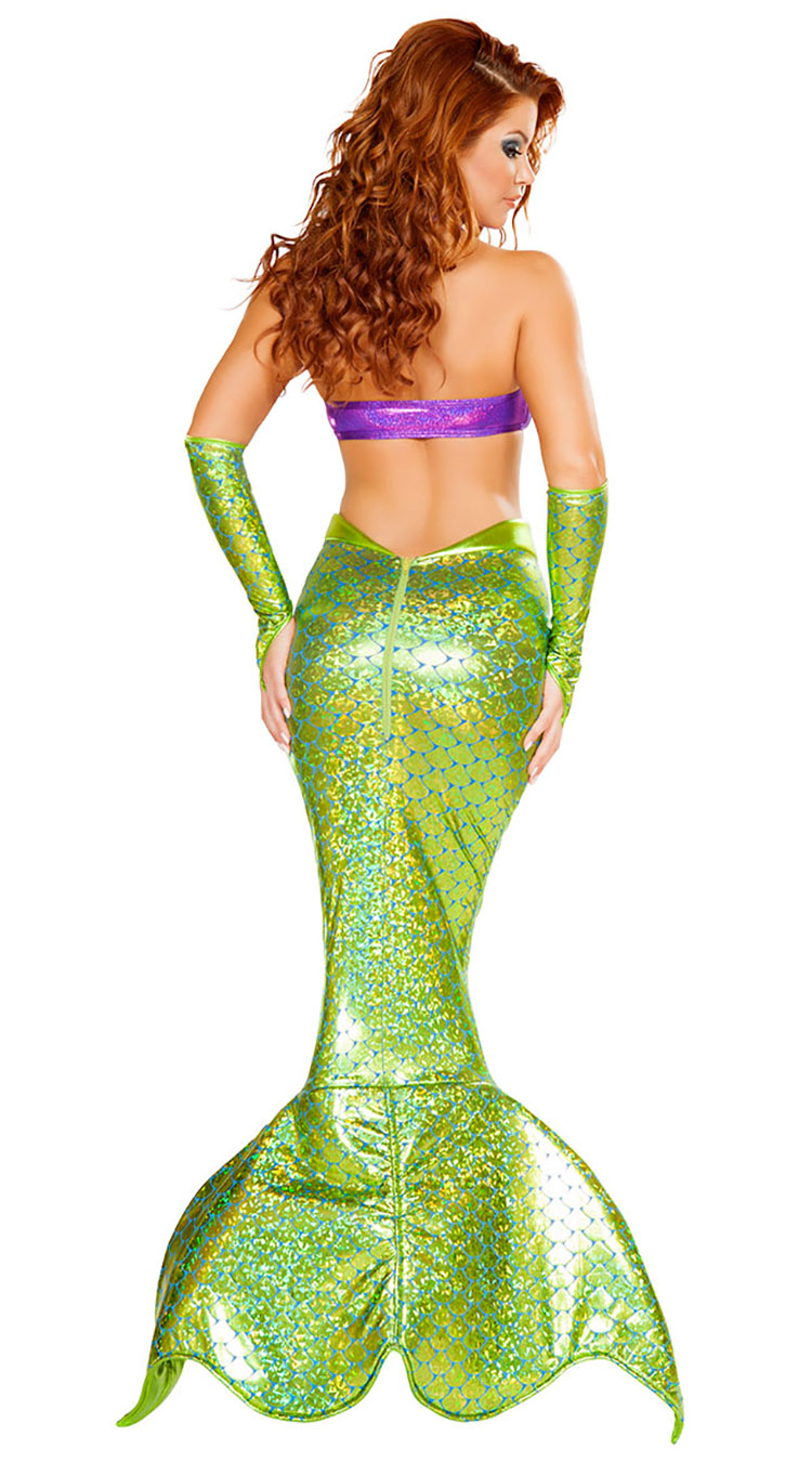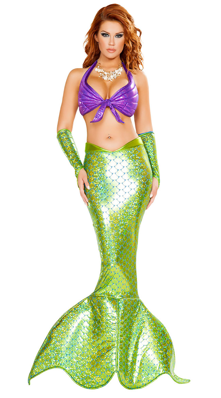 Swim beneath the waves in this Seductive Ocean Beauty costume featuring a purple top with halter straps, a front tie closure, gloves, and a green mermaid tail skirt with a fin detail and back zipper closure.