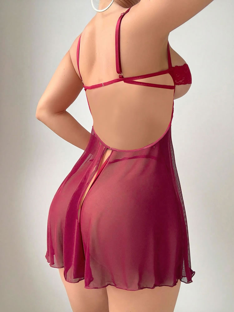This stunning lingerie set is a perfect blend of elegance and allure. The top features a intricate red lace cups detailing, creating a captivating focal point. The adjustable spaghetti straps ensure a comfortable fit, while the sheer mesh fabric enhances the allure. The flared skirt adds a touch of femininity and movement, making it both stylish and comfortable. This set is ideal for those who want to feel both glamorous and confident.