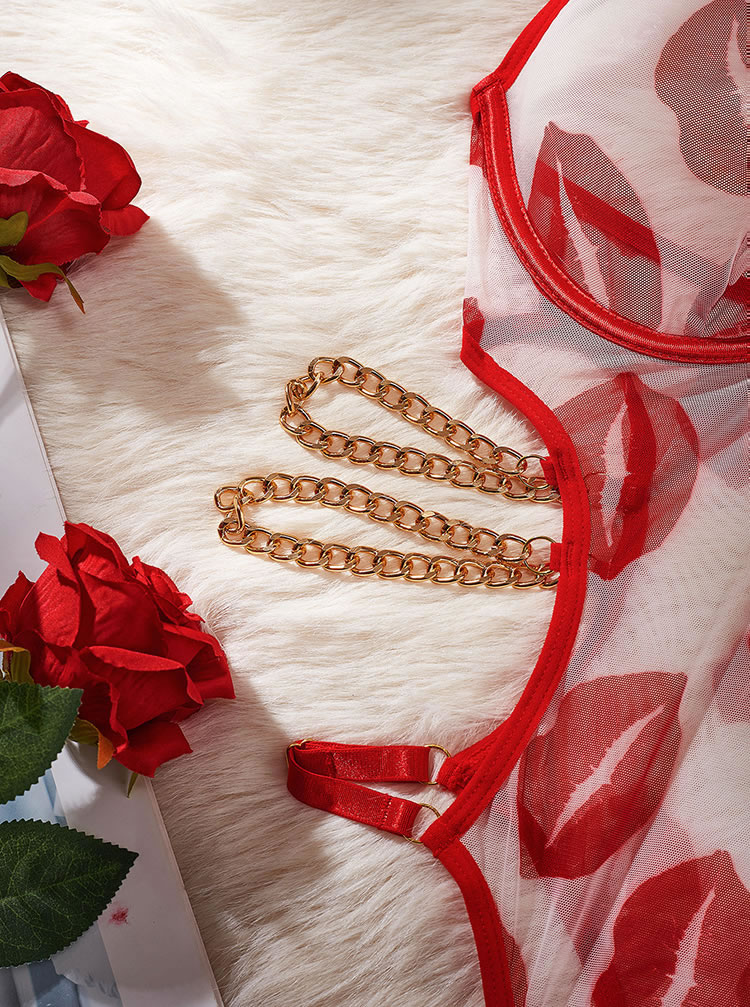 Seductive Red Lip Print Sheer Bodysuit