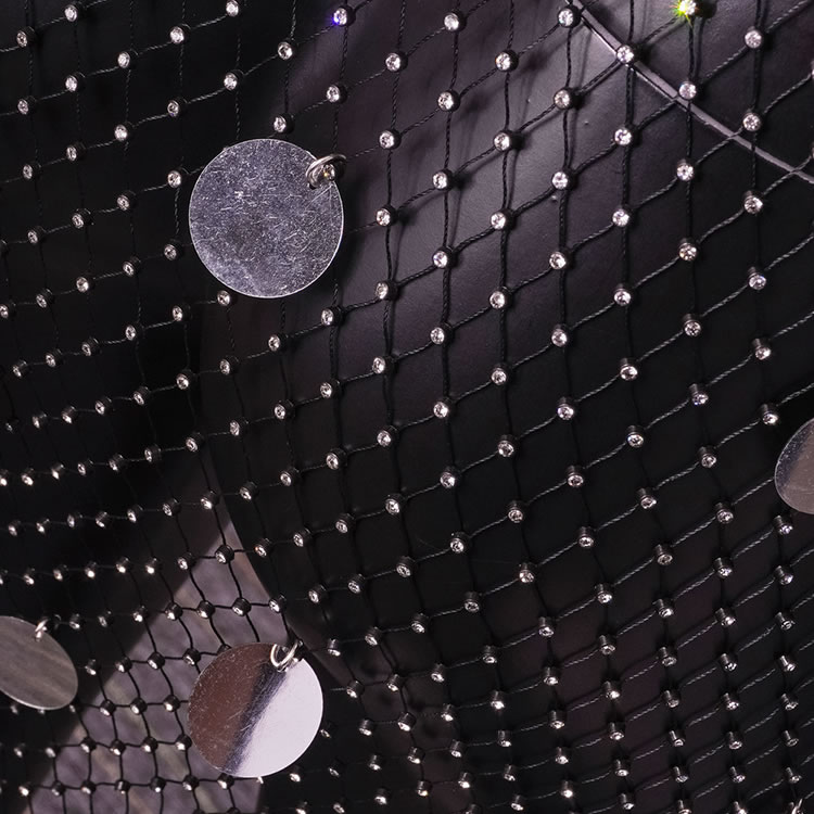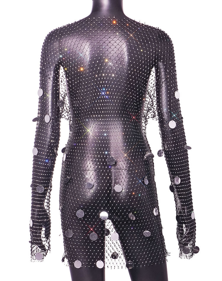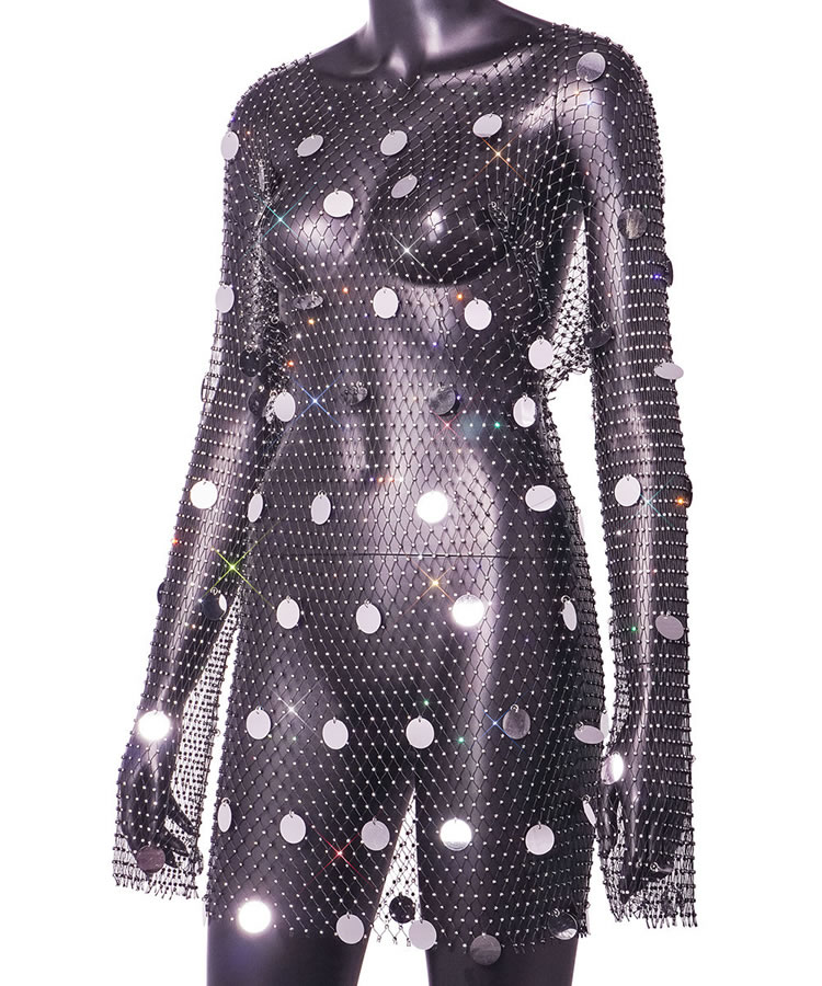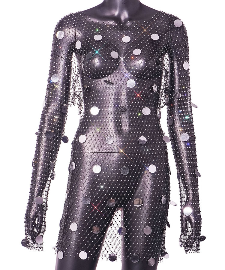 Give your viewers a show in this sultry fishnet dress featuring a high neckline, and a sheer bodice with an allover sequin design. (Only included dress.)