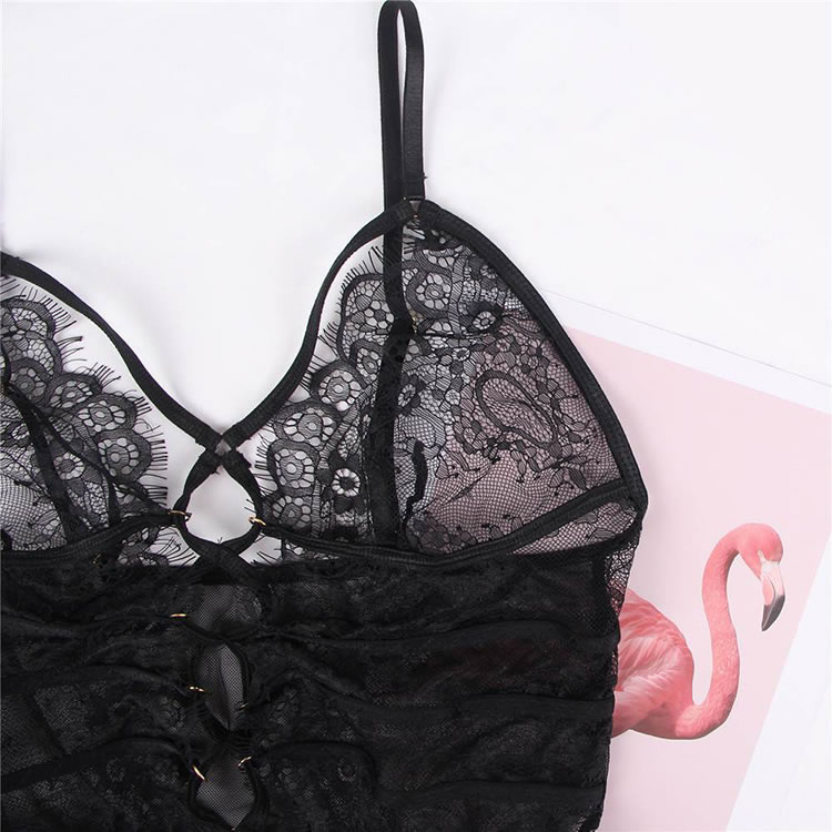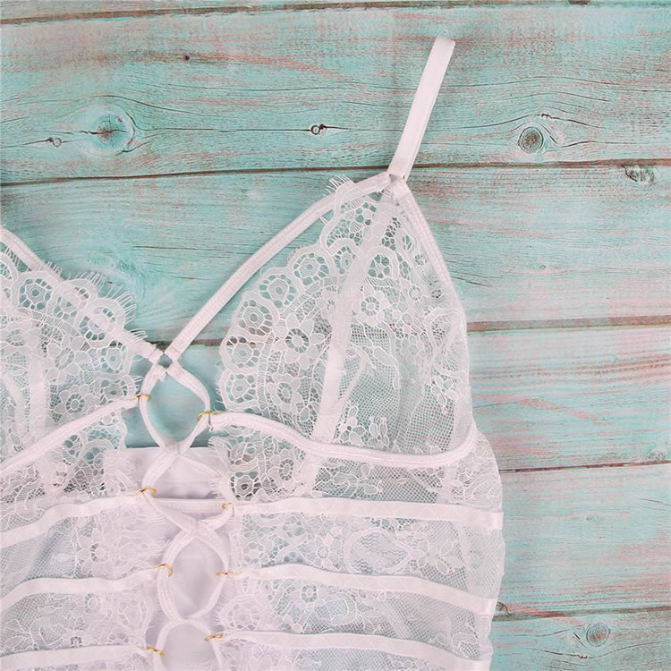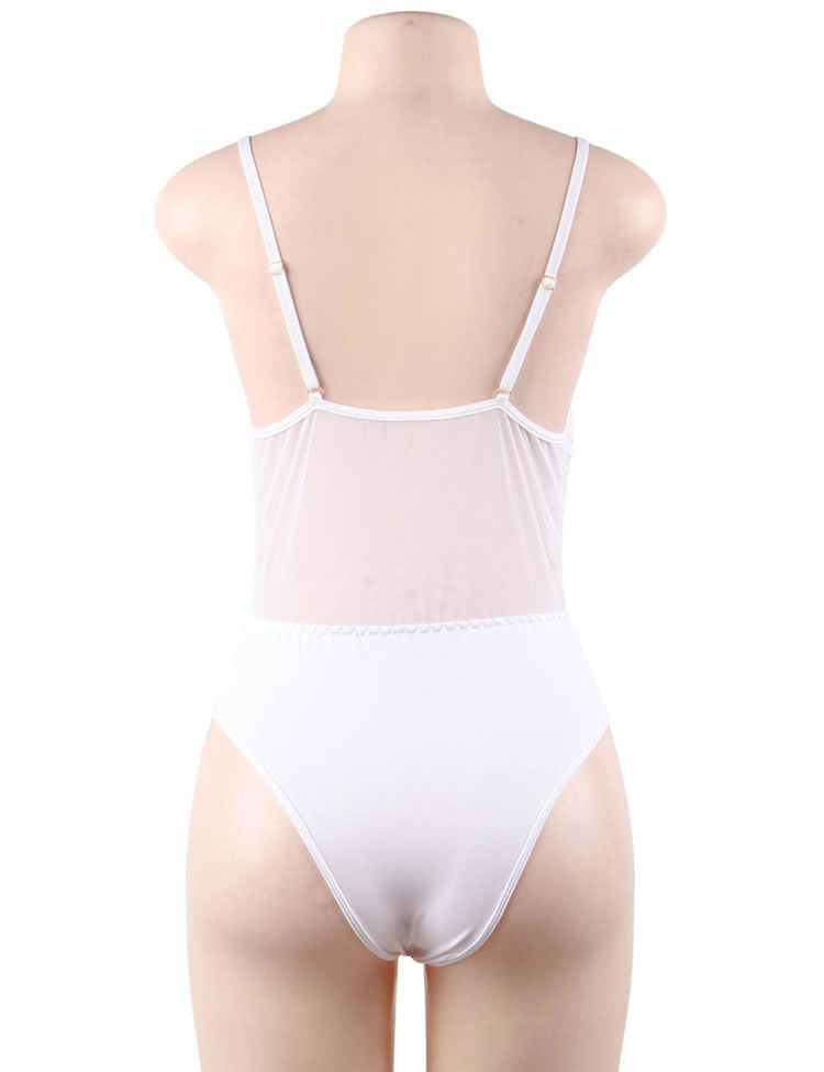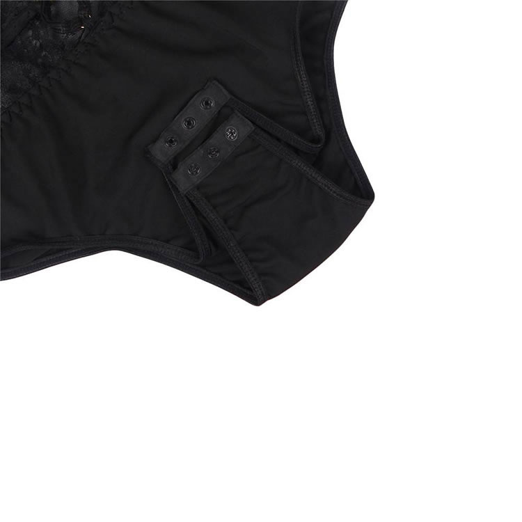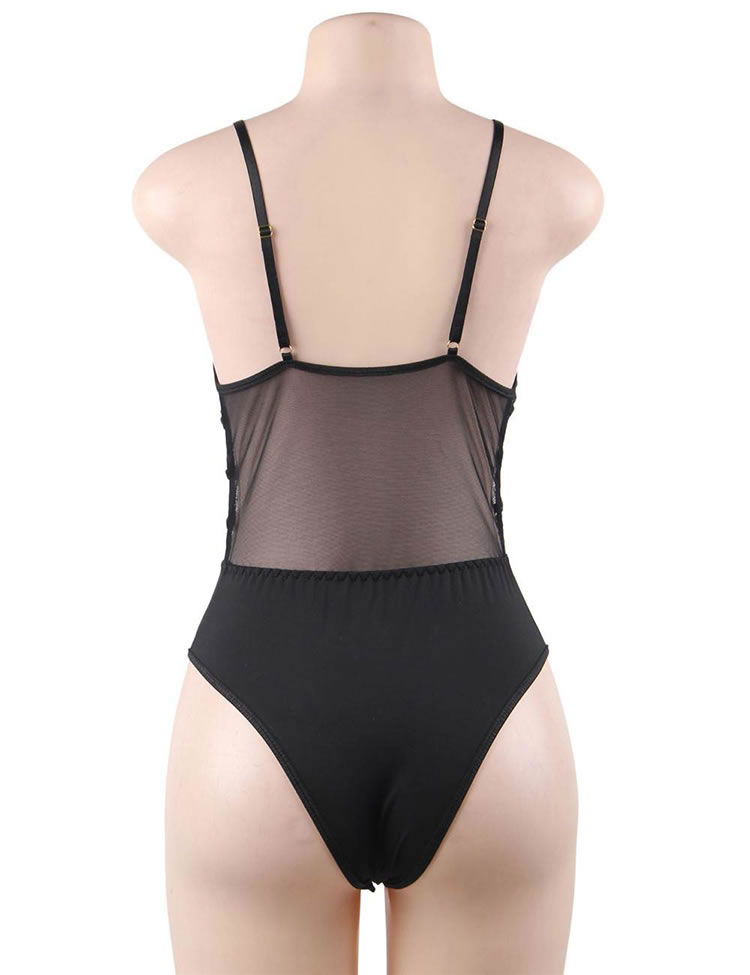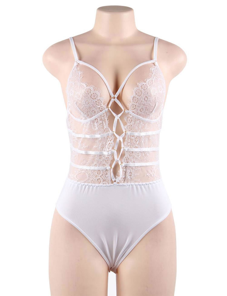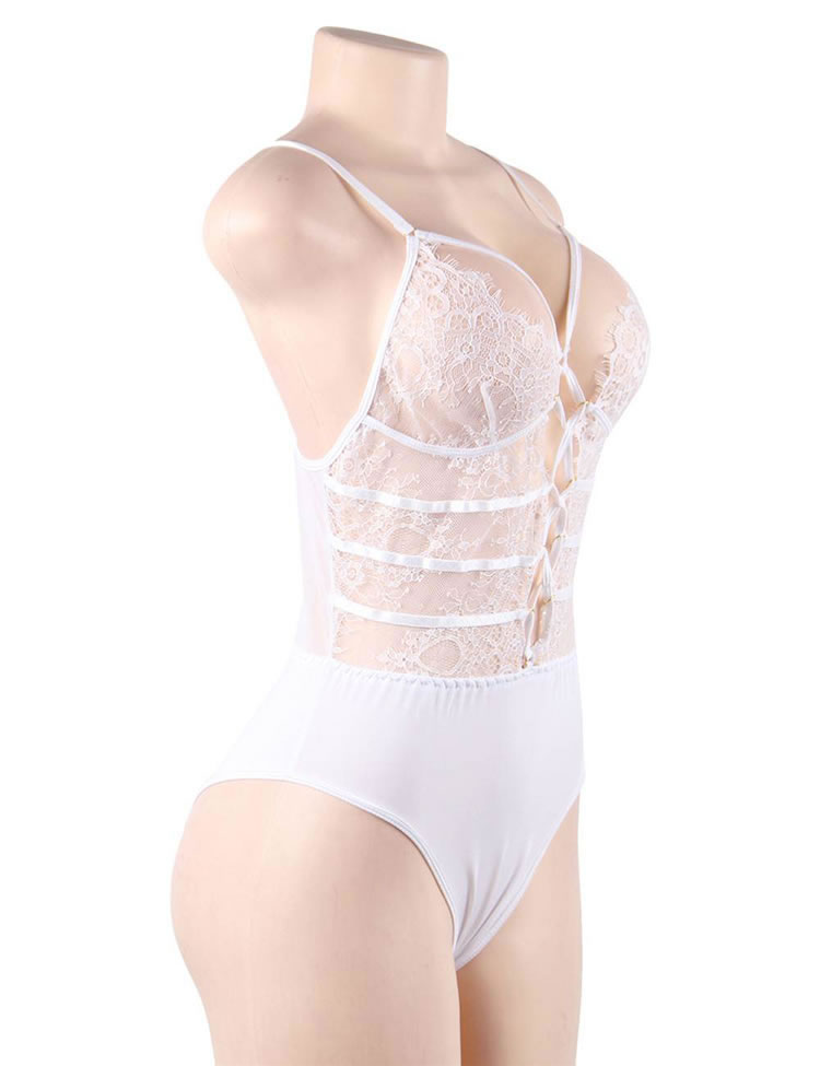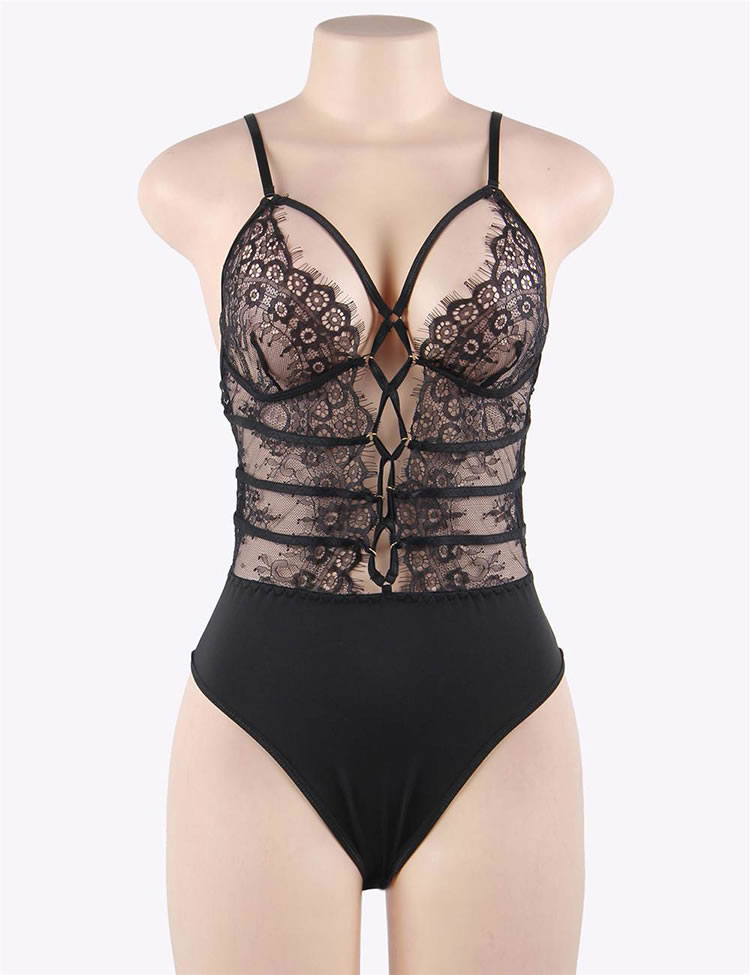 Bump up the glam! Look sophisticated and stylish in this exclusive bodysuit featuring sheer lace cups, a deep V-neckline with criss-cross strappy detailing, adjustable spaghetti straps, an opaque bottom with high cut sides, a snap crotch, and a cheeky cut back.