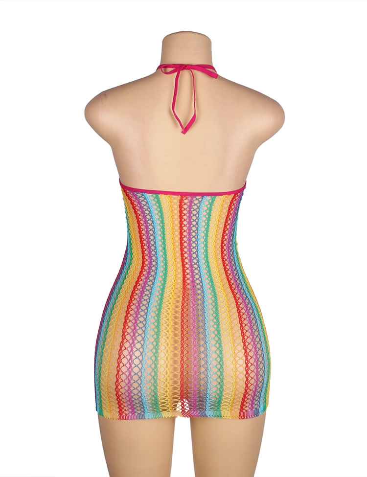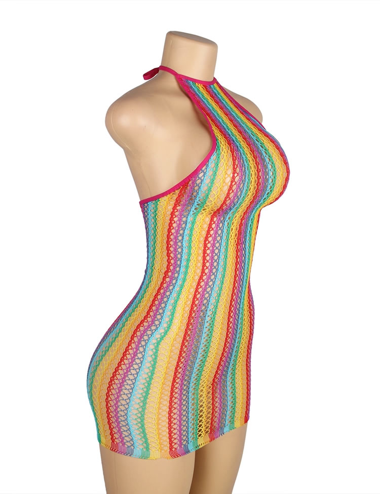 Sexy Rainbow Mesh Hollow Out Bodystocking Dress