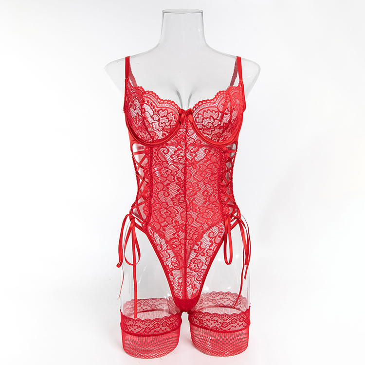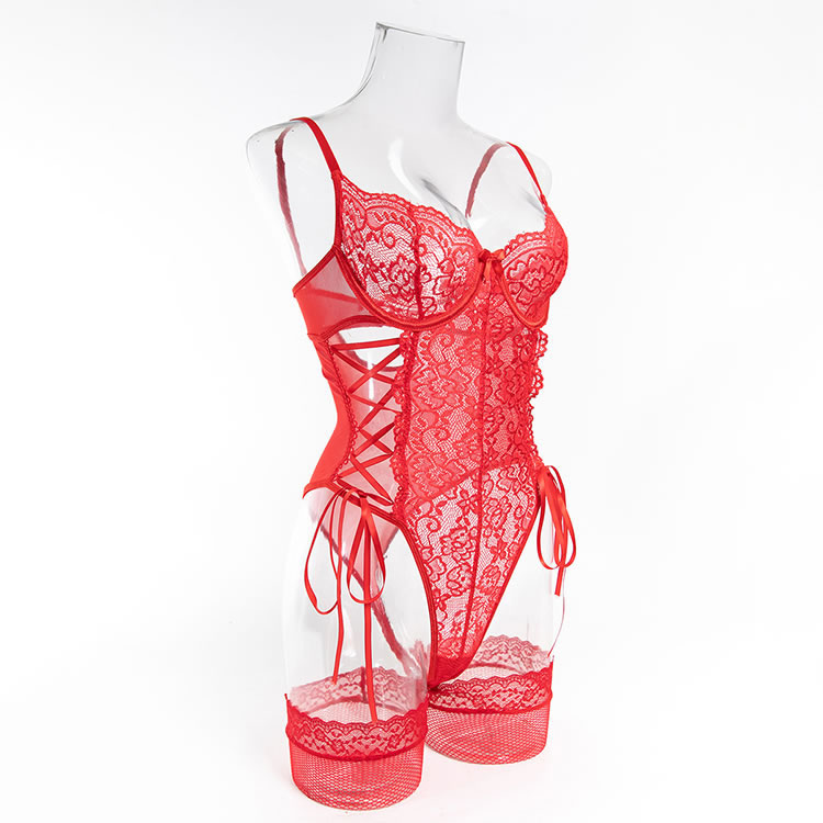 This bold red lace bodysuit features a delicate floral pattern and a flattering silhouette that highlights natural curves. Designed with adjustable side ties and a deep V-neckline, it offers a daring yet feminine look. The open back and sheer mesh panels add a touch of romance, while the built-in bra support ensures comfort and shape. Paired with matching fishnet stockings, this piece is ideal for intimate moments or special occasions where confidence and style take center stage.