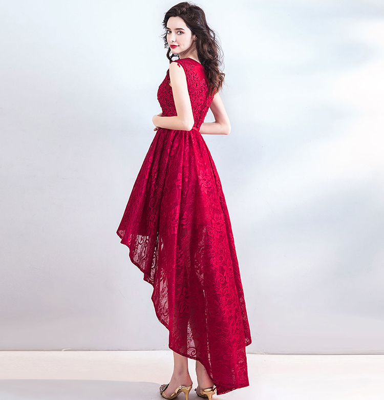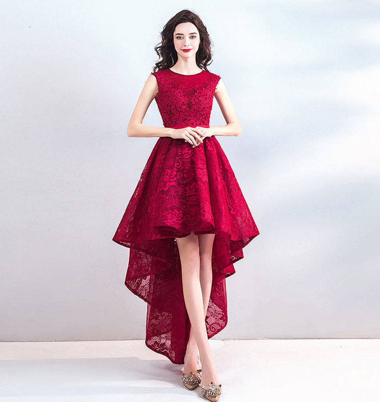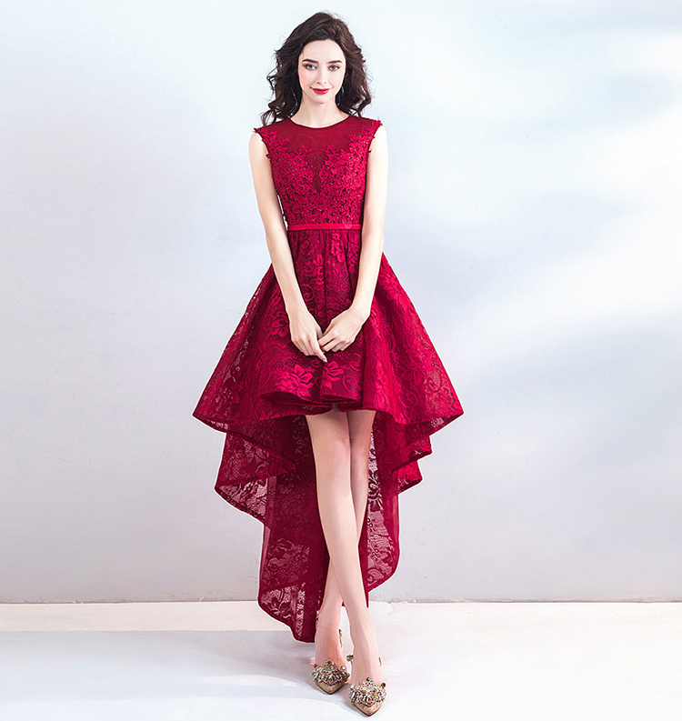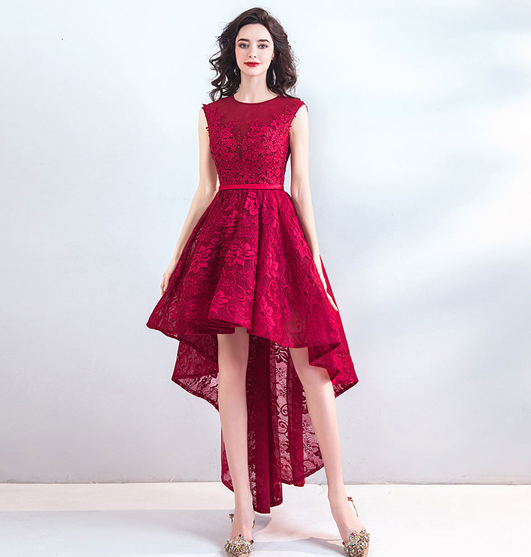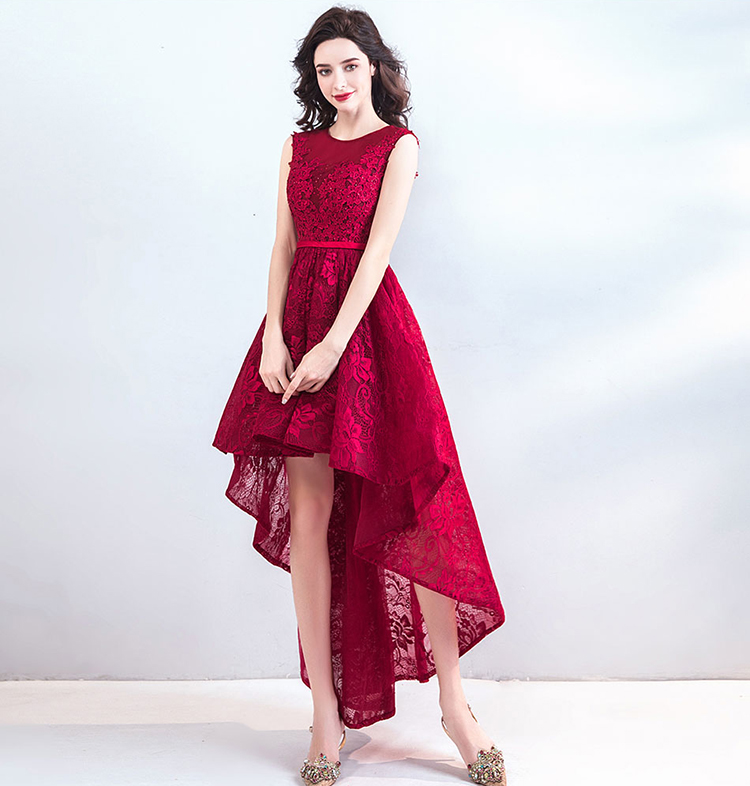 • This dress features a lace illusion bodice and a high low length skirt;  Embroidery flowers; A-line silhouette; High low length.