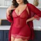 This bold red lingerie set features a sheer mesh chemises with intricate lace detailing along the edges, creating a striking contrast between soft texture and daring transparency. The deep V-neckline is accented with a delicate bow at the bust, adding a touch of romance. Paired with a matching long-sleeve robe that drapes elegantly over the body, this ensemble combines sensual design with graceful movement. The lace-trimmed cuffs and hem enhance its feminine appeal, making it perfect for intimate evenings or romantic surprises.