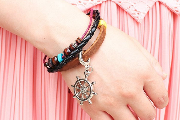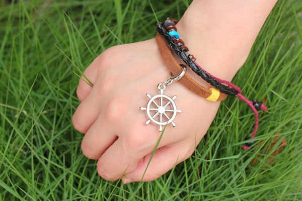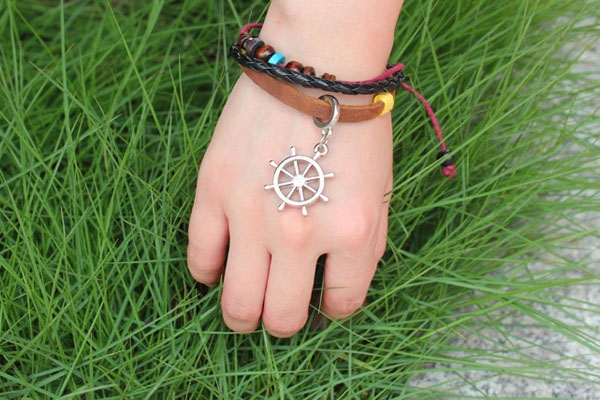 Silver Rudder Pendant Braided Beads PU Leather Bracelet