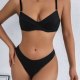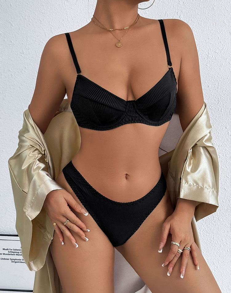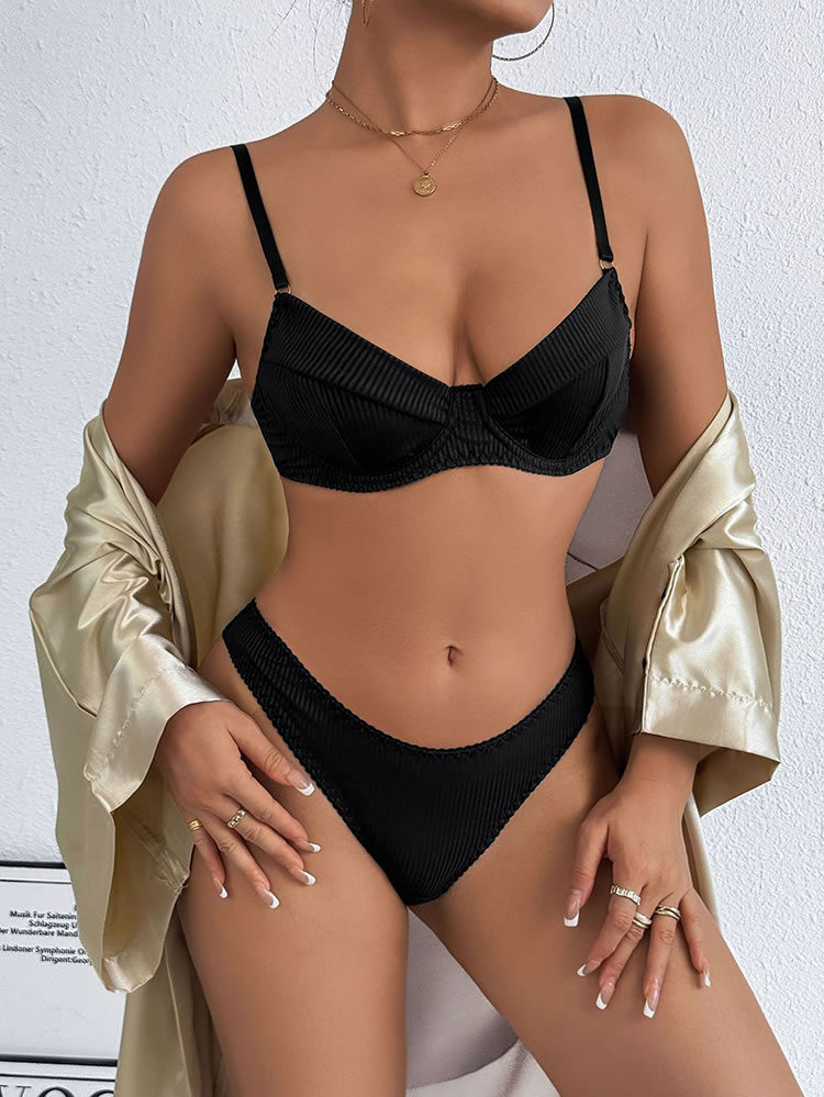 Simple yet striking, this lingerie duo showcases a softly textured fabric with a subtle vertical rib pattern. The bra offers supportive shaping with a deep V-neckline and adjustable straps, while the high-rise briefs provide full coverage with a flattering cut. The understated design makes it ideal for those who prefer minimalism with a touch of elegance.