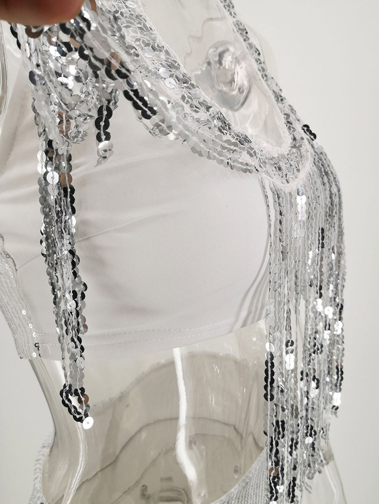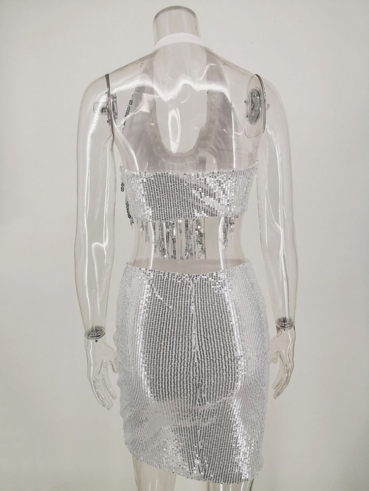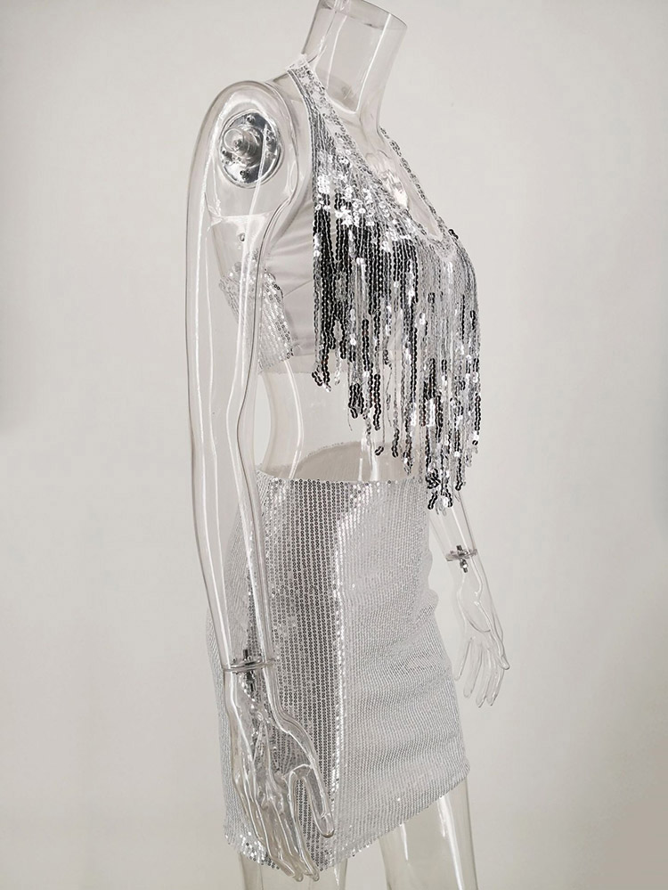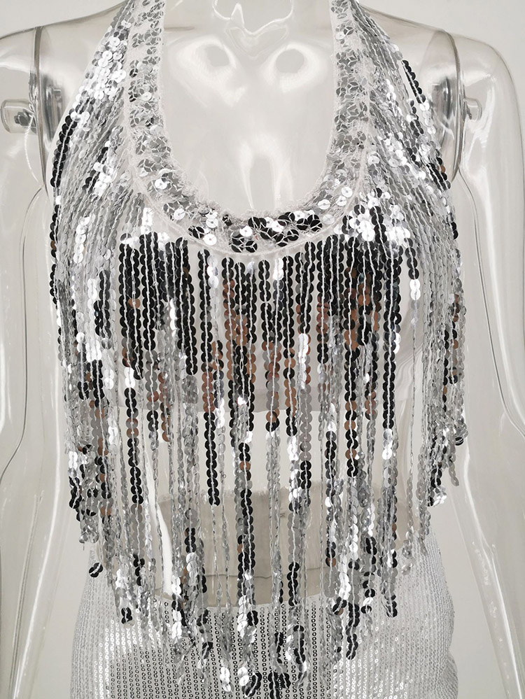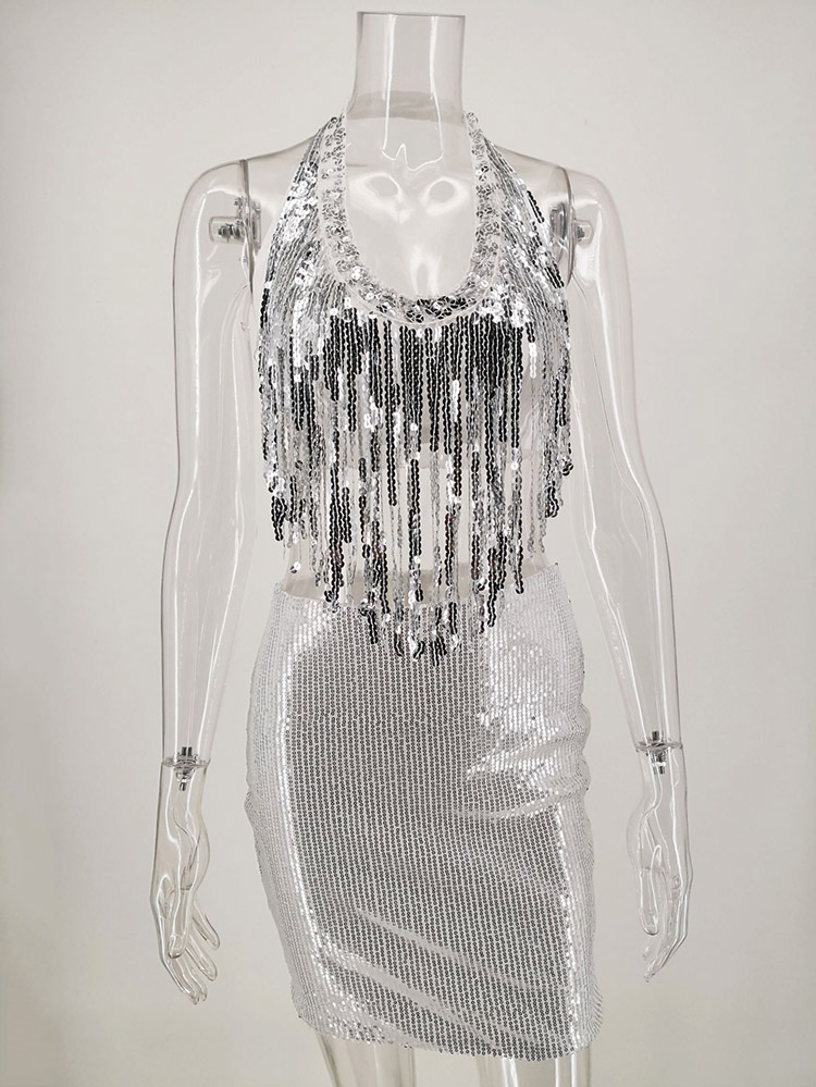 Sleeveless Sequin Tassel Halter Two-Piece Skirt