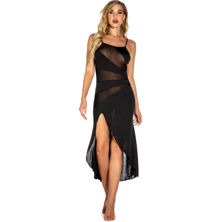 Everyone will be watching you in this spectacular midi dress featuring adjustable spaghetti straps, and an asymmetrical hem, and a matching thong panty.