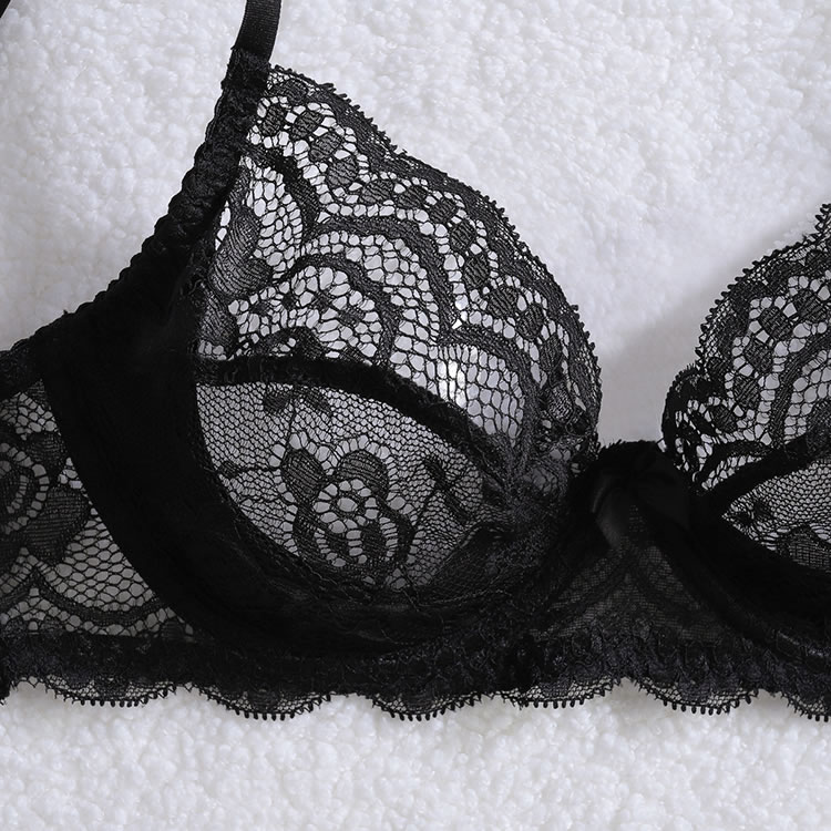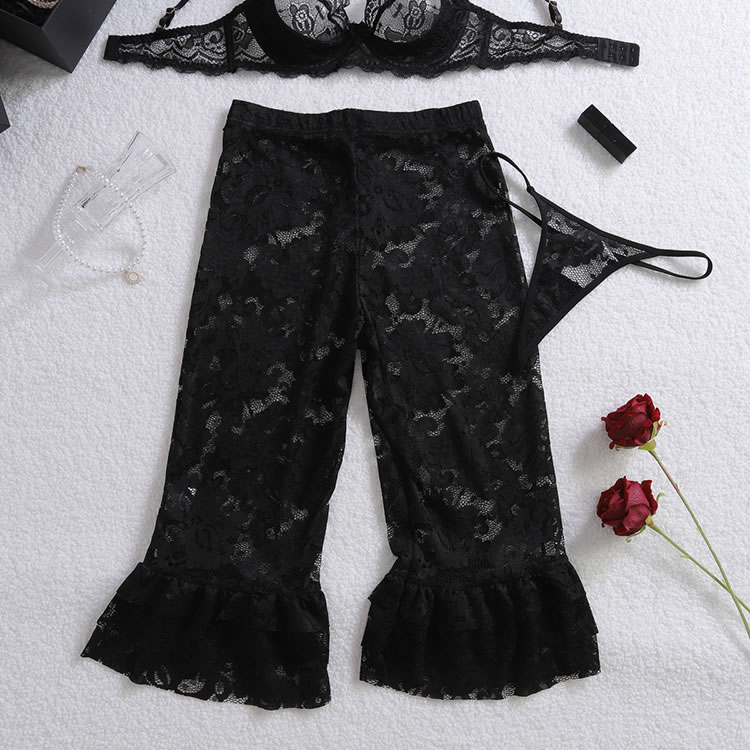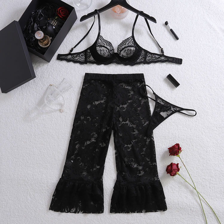 This striking black lace lingerie set is designed to make a statement with its intricate floral patterns and sheer fabric. The bra features delicate lace detailing that enhances the natural curves, while the matching high-waisted shorts add an extra layer of allure. Perfect for those who want to feel both confident and seductive.