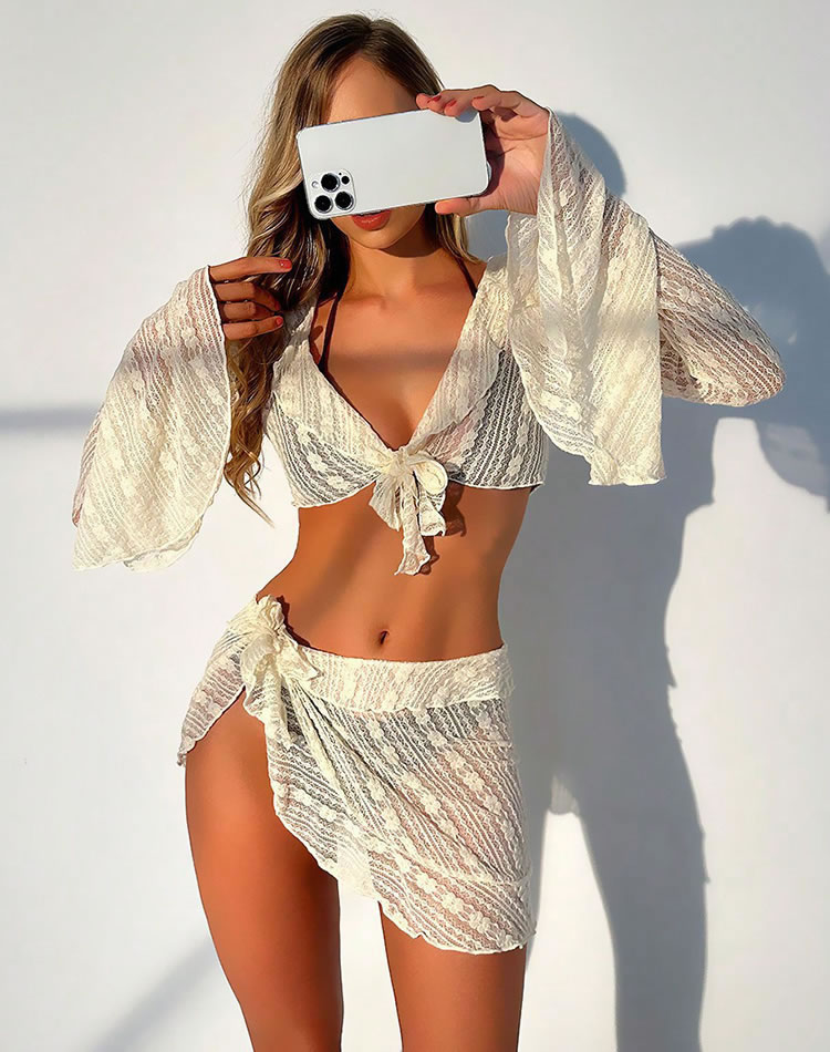 Stay stylish and cool in this swimsuit set. The lace bikini top pairs seamlessly with a sheer cover-up that ties at the front, ensuring both comfort and elegance. This bikini is ideal for adding a touch of sophistication to your summer wardrobe.