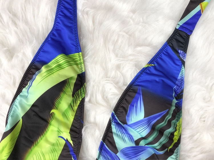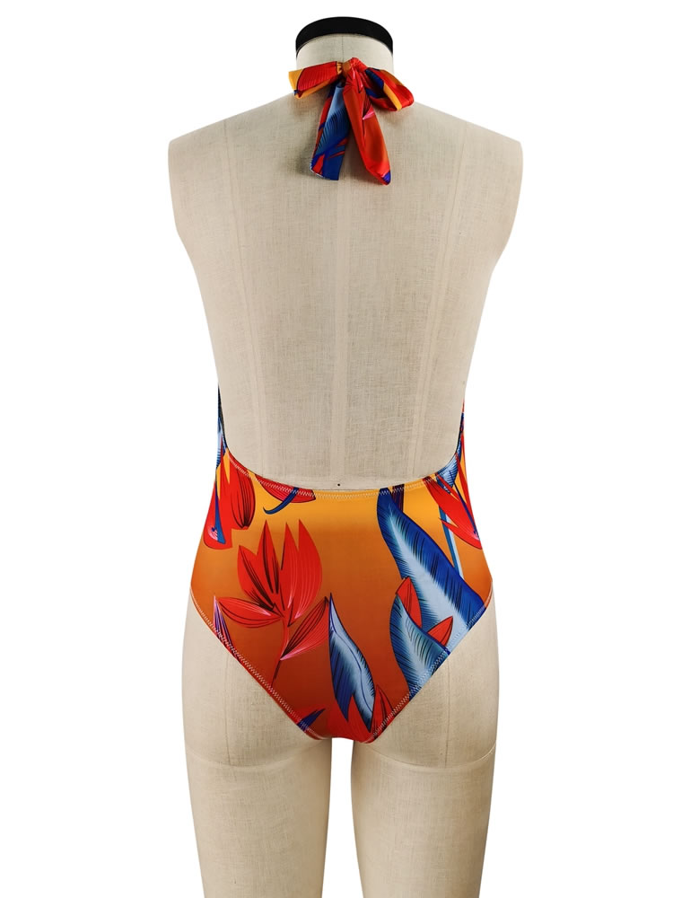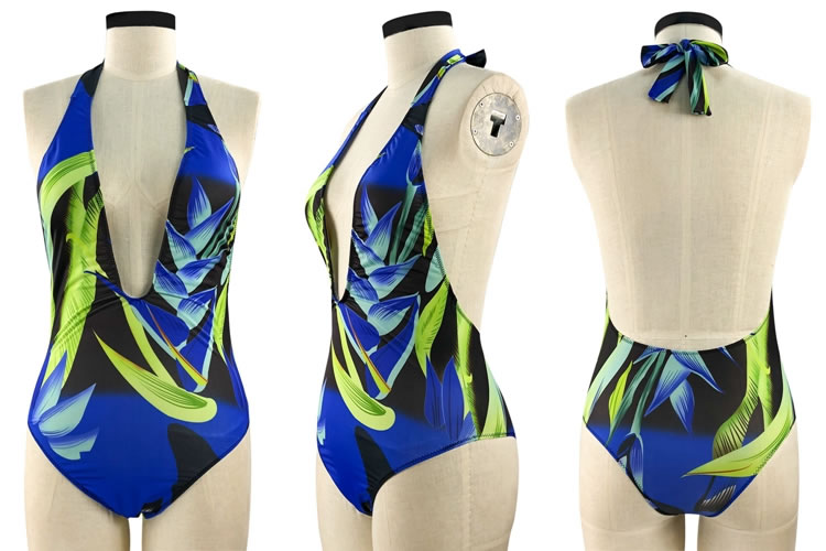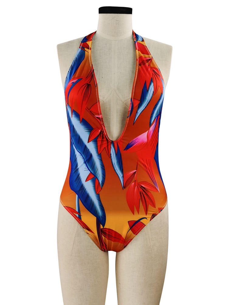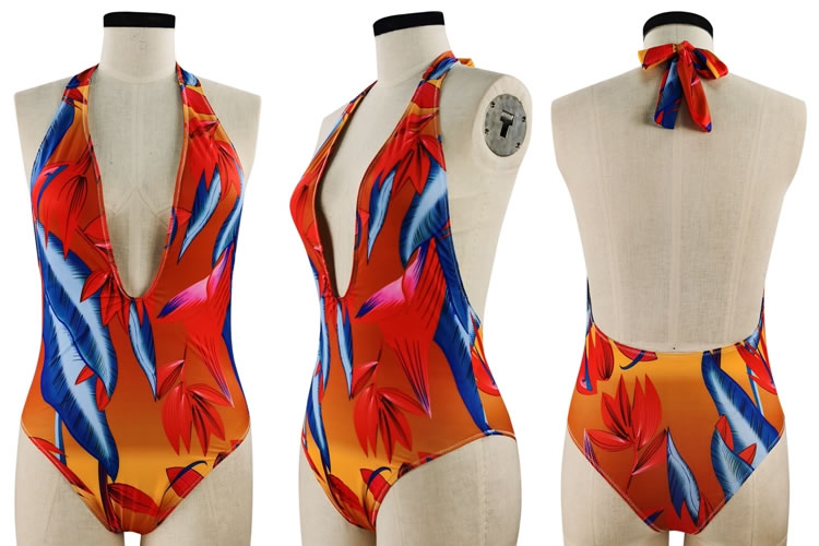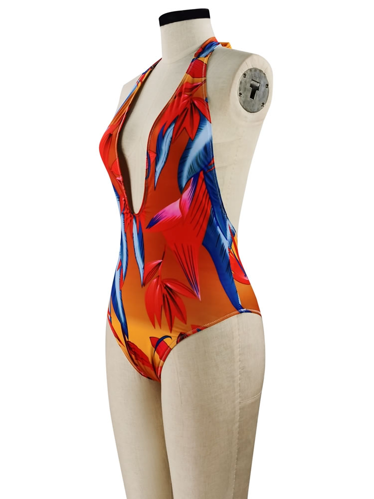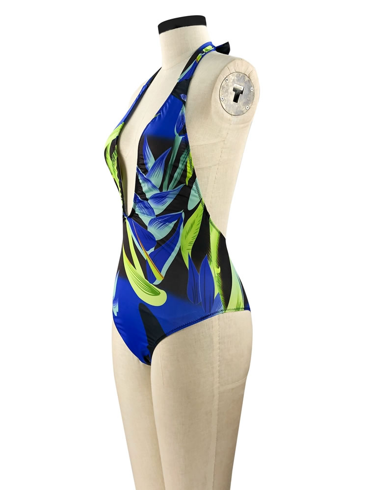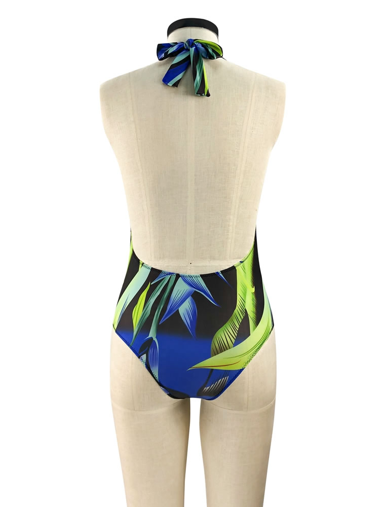 Highlight your sunkissed skin in this exclusive black swimsuit featuring a plunging neckline, halter ties, a low open back, high cut sides, and a cheeky cut back.