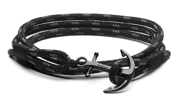 This triple wrap Tom Hope bracelet features a black anchor, black whipping twine and a black trim line.
