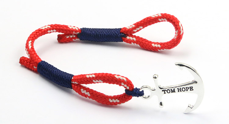This Tom Hope bracelet features a silver anchor, with blue whipping knot details. Crafted from a vibrant red cord, red is known to be the colour of romance and love. A versitile piece which can be worn for all occasions, adding character and style.