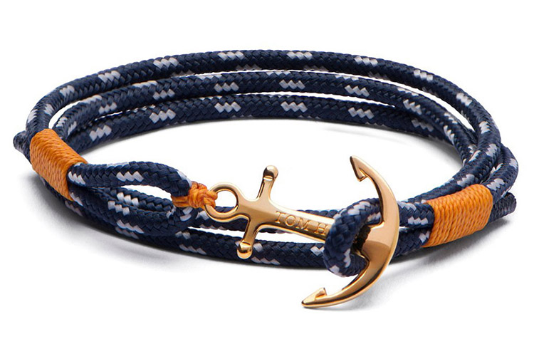 This triple wrap Tom Hope bracelet features an anchor, with tan and gold whipping knot details. Gold is known to be the colour of wealth and luxury. A versitile piece which can be worn for all occasions, adding character and style.