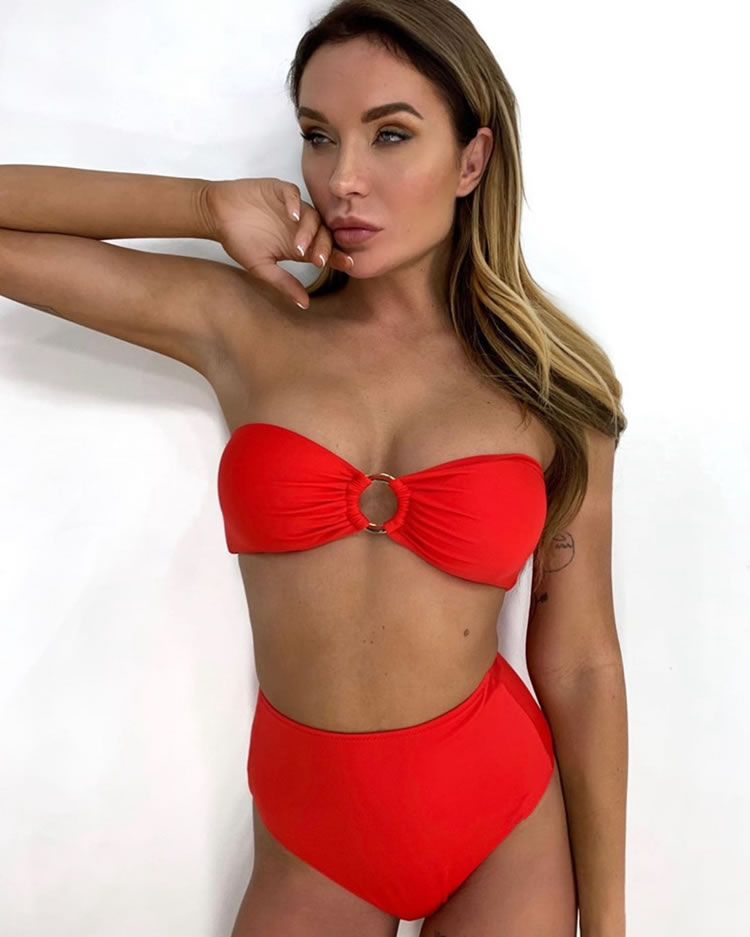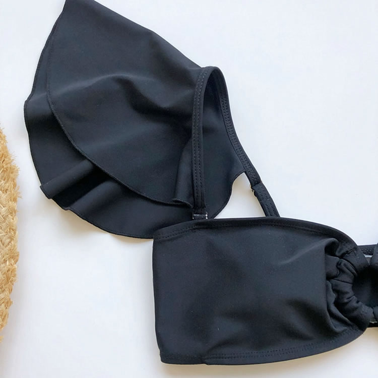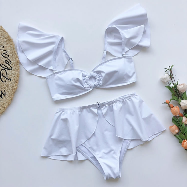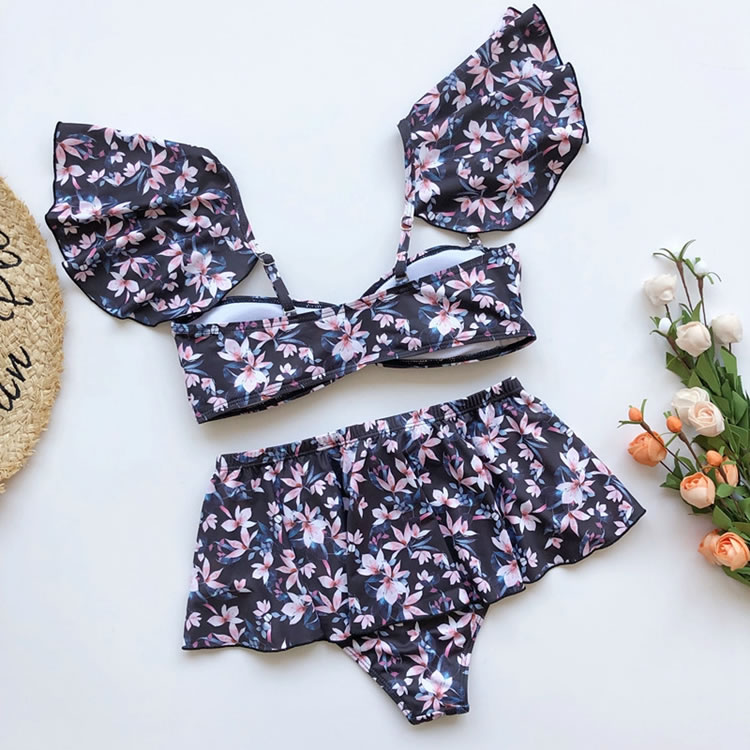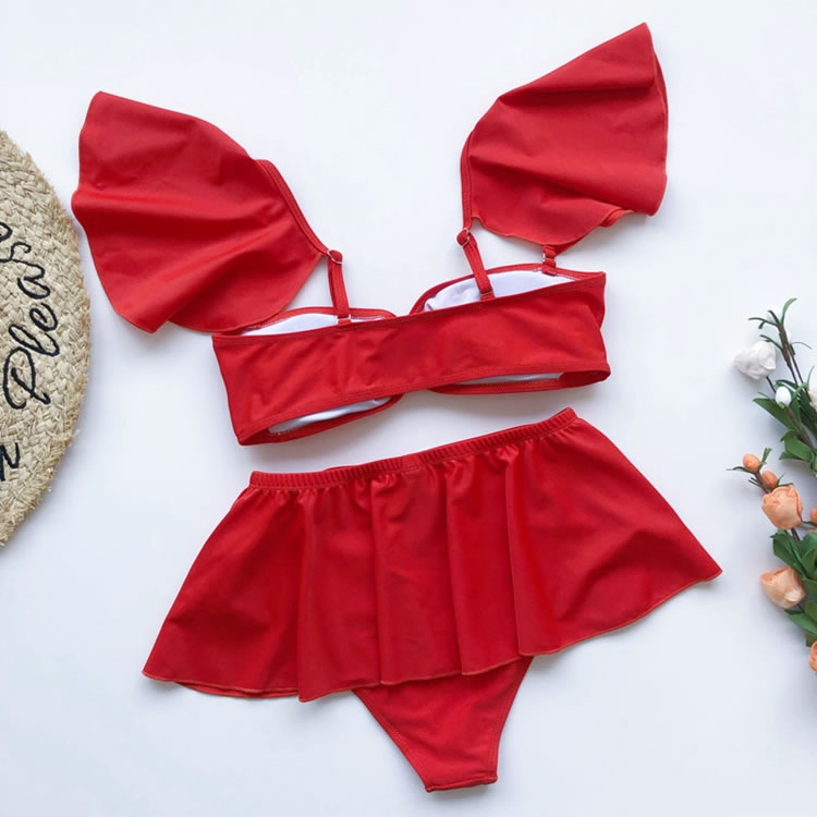 Hit the sandbar in this exclusive bikini set featuring removable adjustable spaghetti straps, a soft sweetheart neckline, a pullover style, a high-waisted bikini bottom with a cheeky cut back, and a matching ruffled mini skirt.