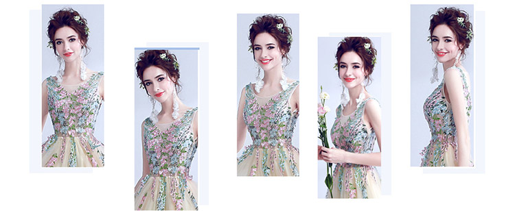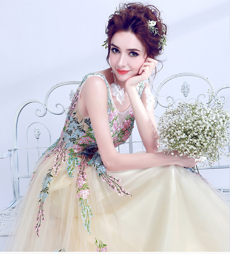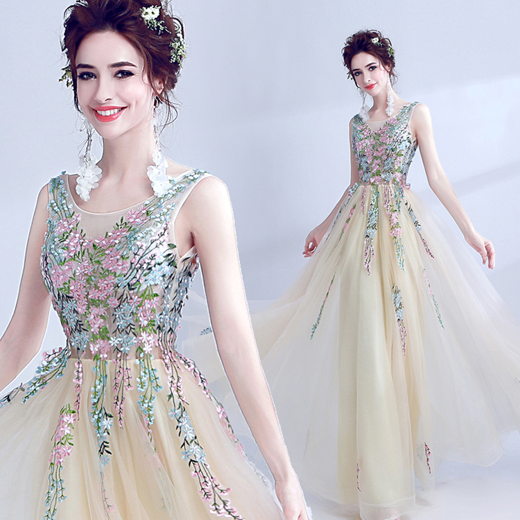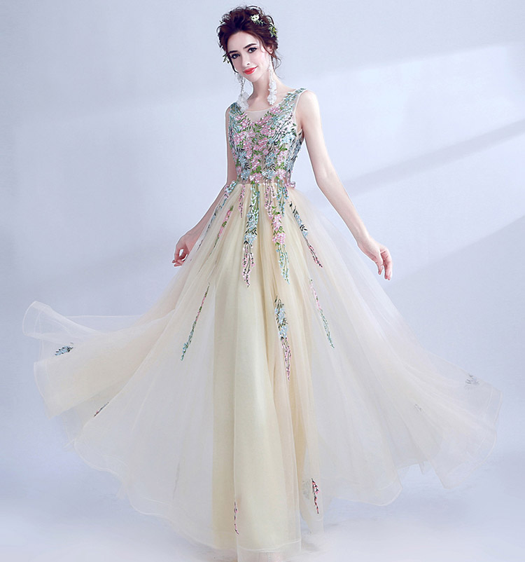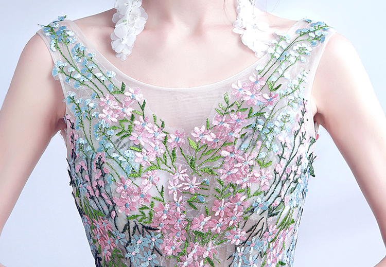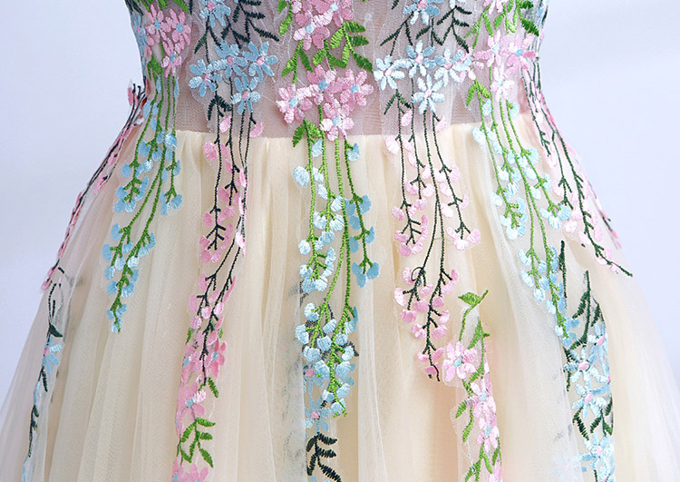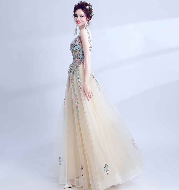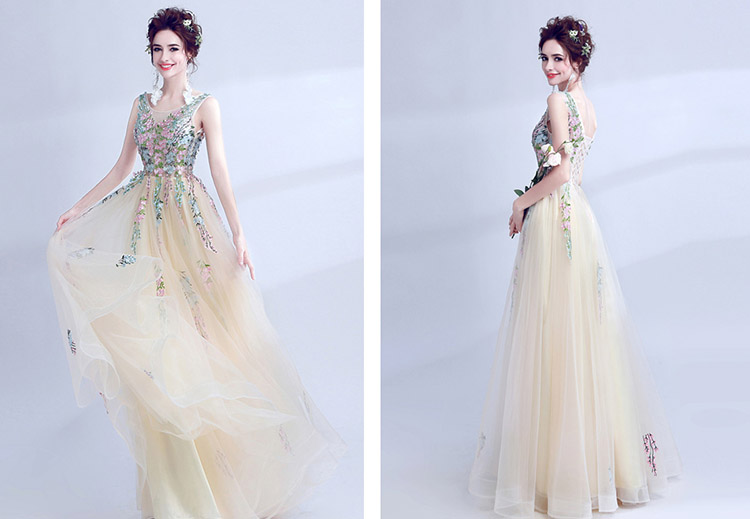 V-neck Embroidery Lace Prom Dresses Sleeveless Tulle Evening Prom Gowns