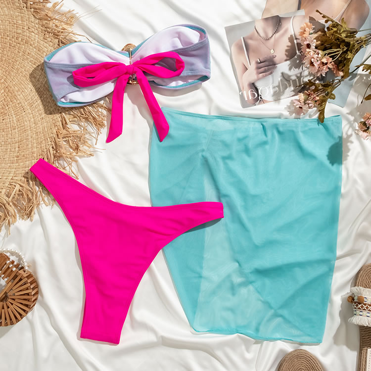 Embrace the vibrant gradient colors of this bandeau bikini, featuring a sleek buckle detail that adds a touch of edginess. The top and skirt are designed to flatter your figure, making it perfect for those who want to feel bold and stylish by the pool or beach.