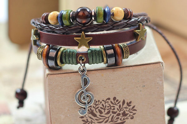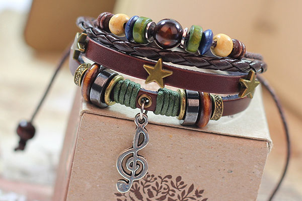 Vintage Alloy Musical Notation Beads Braided PU Leather Bracelet With Star