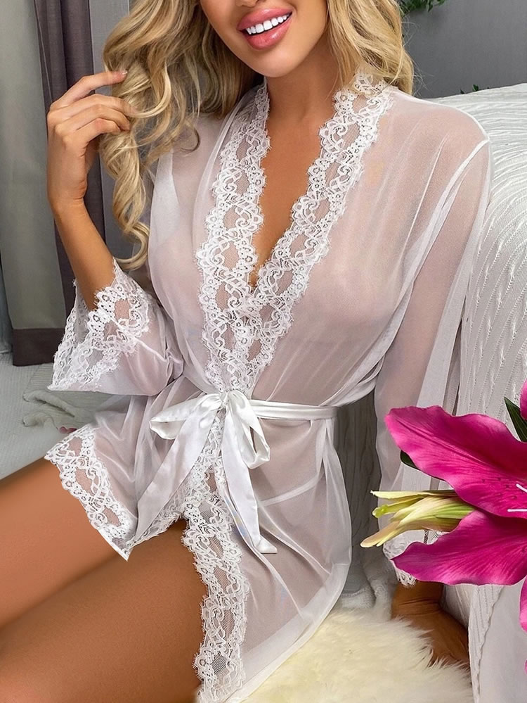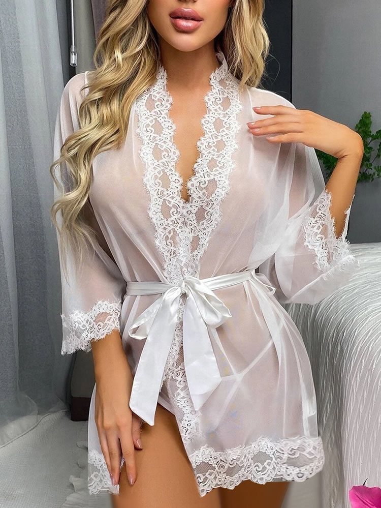Turn lounging into an extravagant affair in this exclusive mesh robe featuring 3/4 length, eyelash lace sleeves, a comfortable mesh bodice, an eyelash lace trim, and a matching waistband. (Panty included.)