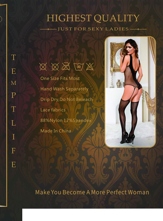 Dare to go somewhere seductive in this alluring bodystocking featuring a deep scoop neckline with circular cut-out trim, thick shoulder straps, a sheer fishnet bodice with vertical seam, attached garters, and fishnet thigh highs with an over the toe style.