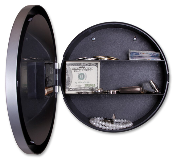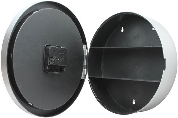 Hide your valuables in this 10" fully functioning clock that opens to reveal a hidden safe. The face opens to reveal two flat shelves and one rounded ledge that will hold jewelry, cash, credit cards or other small valuables. Simple hinged design. This easy-to-hang wall clock requires 1 AA battery (not included).