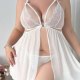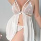 Combining soft textures and daring details, this white lingerie dress showcases a lace-accented top with thin adjustable straps and a bow. The semi-sheer skirt drapes loosely around the hips, enhancing natural curves. With an open front and a subtle back cutout, it offers both style and confidence-boosting appeal. Perfect for those who enjoy a mix of innocence and allure in their nightwear.