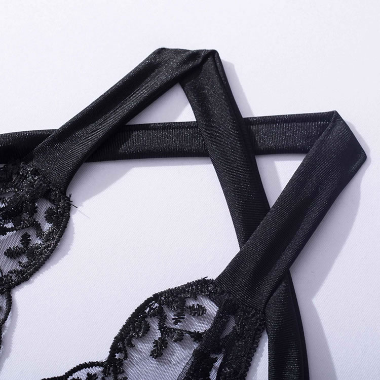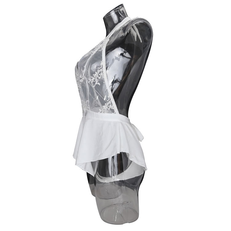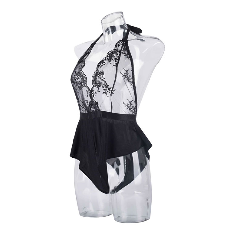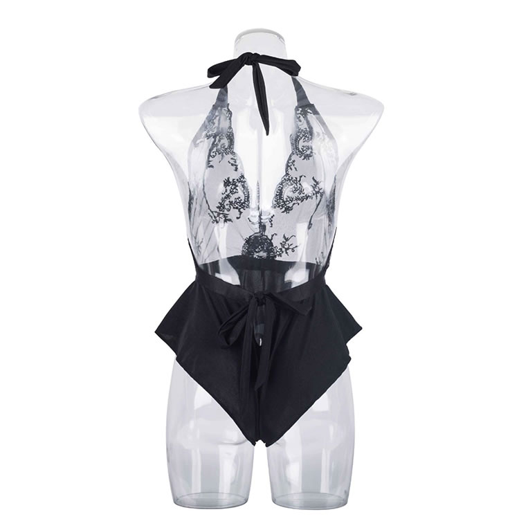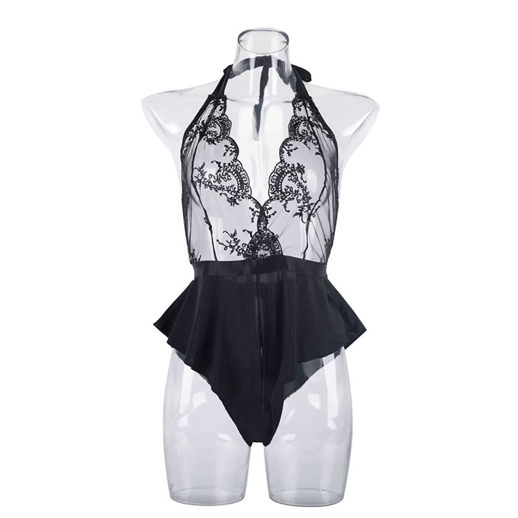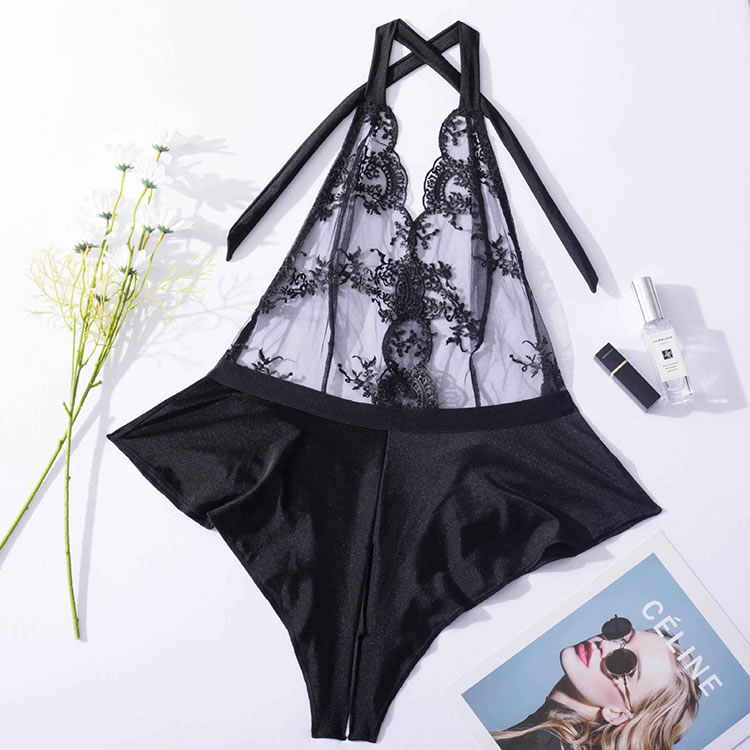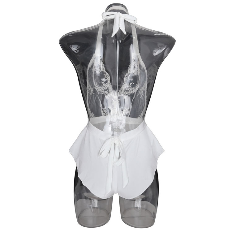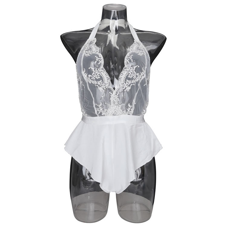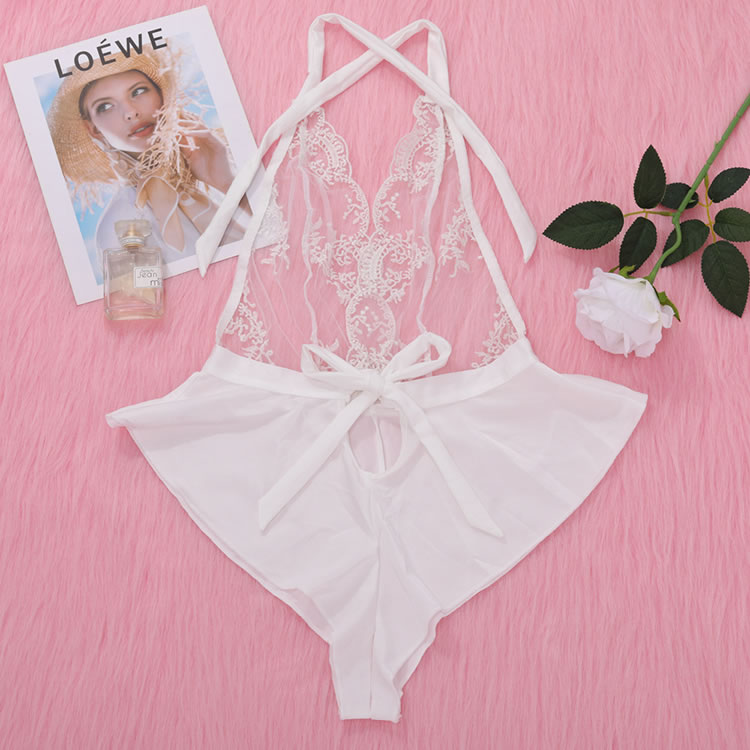 This white lace bodysuit combines sheer elegance with a touch of allure. The intricate lace detailing on the bodice adds a delicate charm, while the halter neck and open back design enhance its seductive appeal. The soft fabric ensures comfort, making it perfect for special evenings or intimate moments.