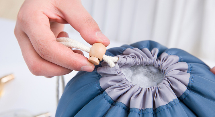main barrel drawstring + attached detachable small zippered bag allow for important fabrics like earrings, rings, necklace etc + PVC bag for makeup brush or