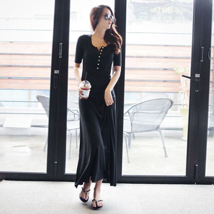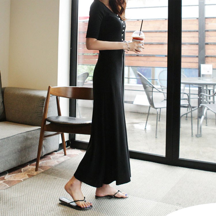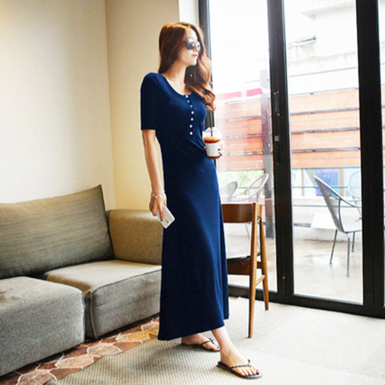 Women's Round Neck Short sleeves Solid Color Slim Long Dress