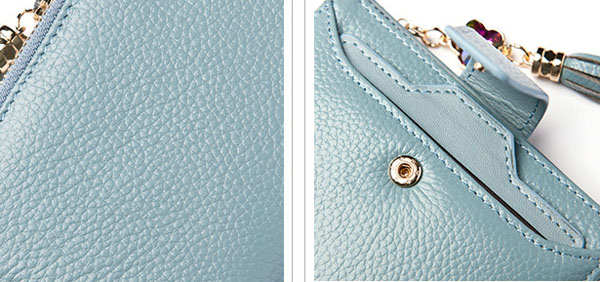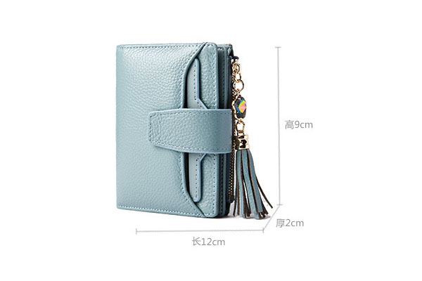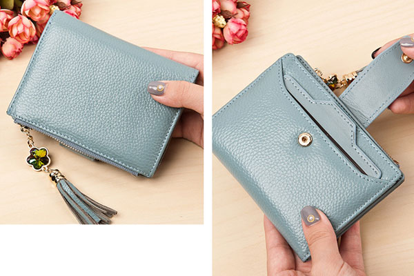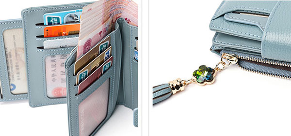 15 card holder; 2 photo slots; 1 coin zipper pocket with tessel decoration; 1 bill section; 2 removable card slots