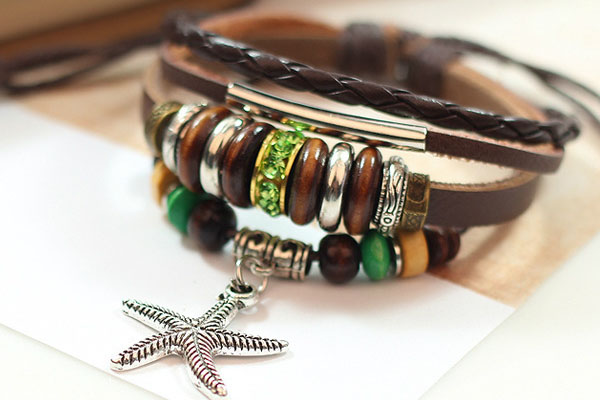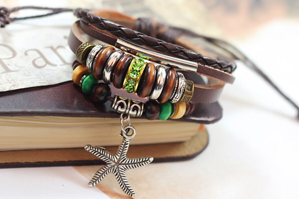 Wooden Beads Handmade Braided Leather Bracelet With Alloy Star Pendant